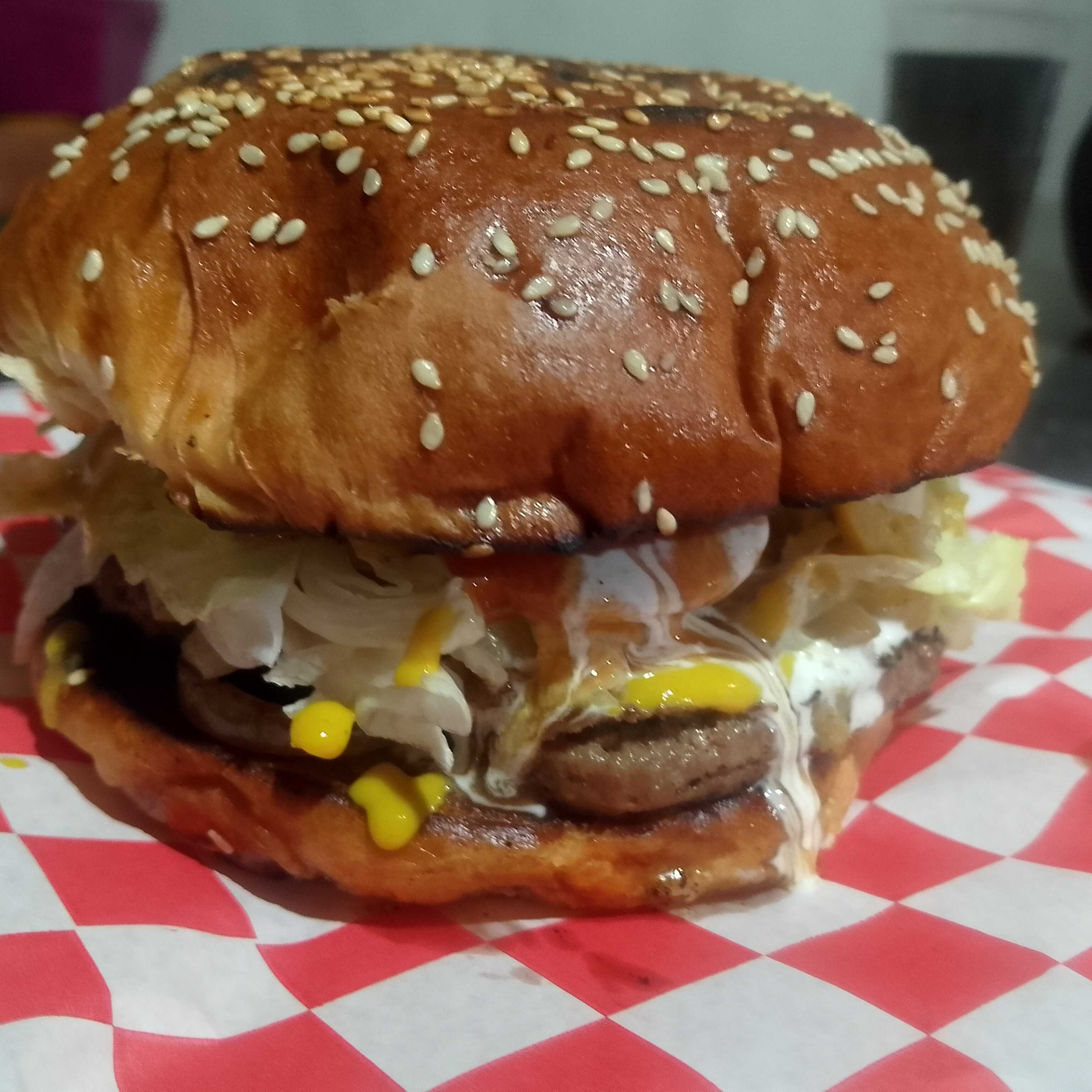 Pan,carne,queso amarillo, cebolla, tomate, lechuga,aguacate, aderezos