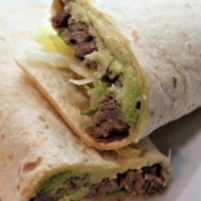 Súper burro de Tortilla grande con carne asada, cebolla,tomate, lechuga, aguacate y aderezos