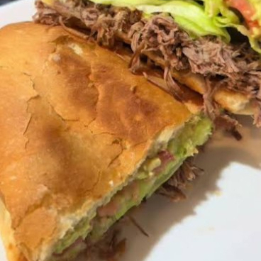 Pan telera,carne deshebrada,crema,cebolla, tomate, lechuga y salsa