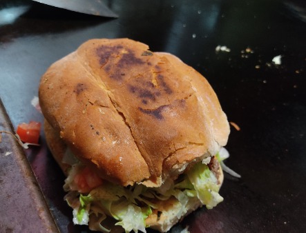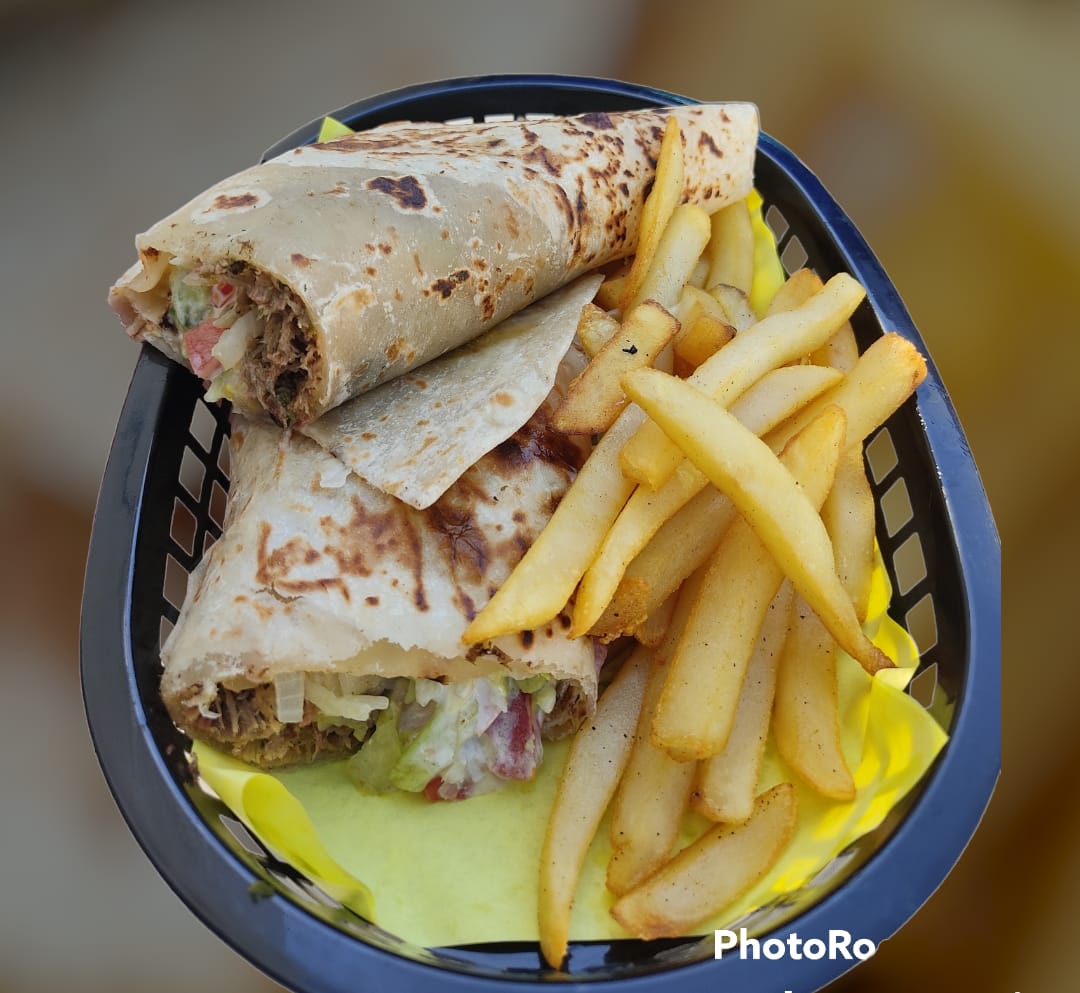 Pan de telera, carne deshebrada, verdura, líquidos e incluye papas fritas