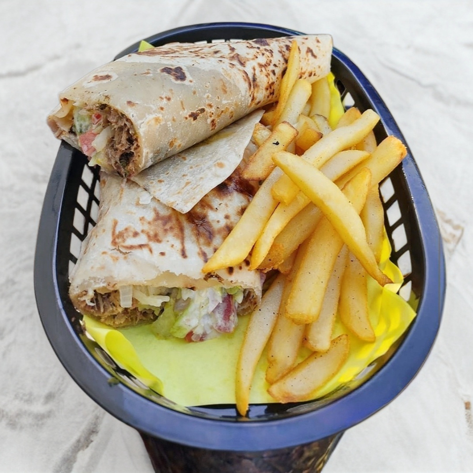 Tortilla de harina hecha a mano, carne deshebrada, 2 salchichas, chorizo, queso blanco. Incluye papas.