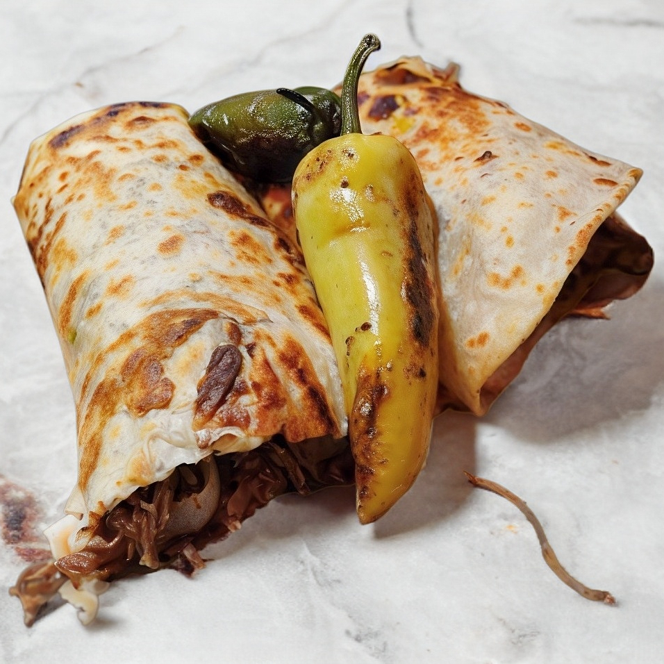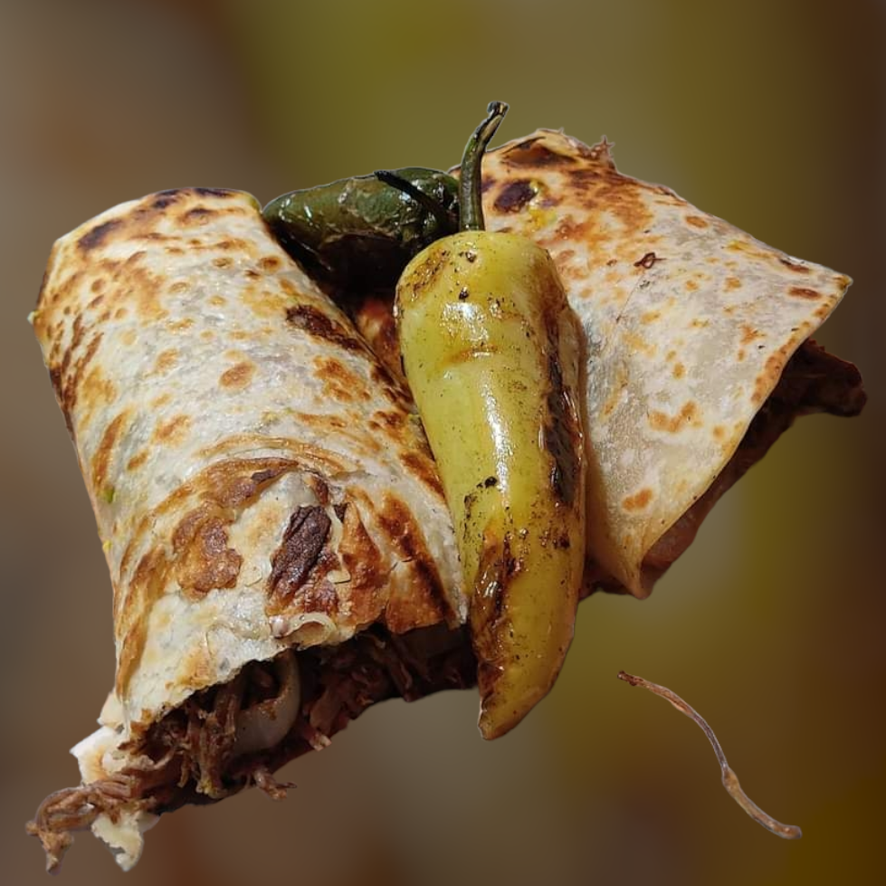 Tortilla de harina hecha a mano, carne deshebrada, queso blanco, verduras, líquidos.
