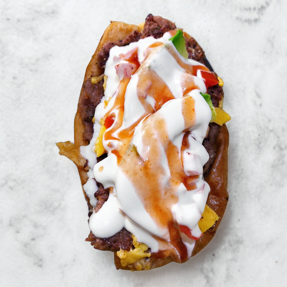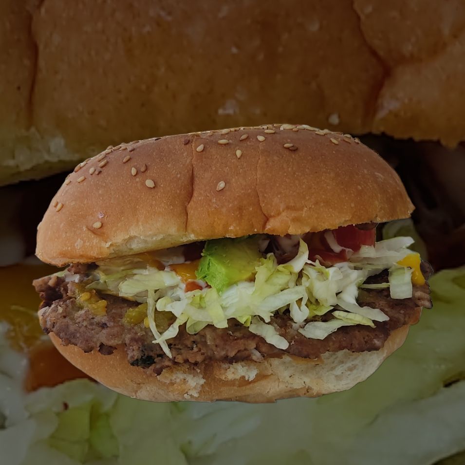 Pan de hamburguesa, carne de res, carne deshebrada, verdura y líquidos.