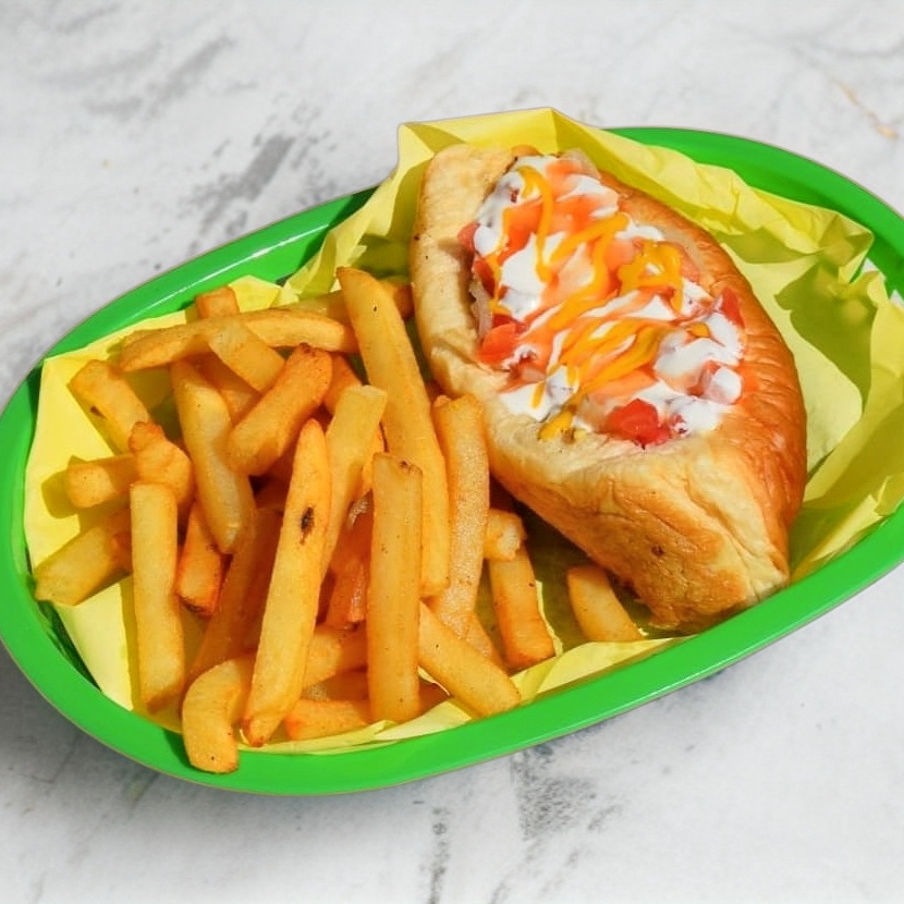 Pan telera, carne deshebrada, queso blanco, salchicha, chorizo. Incluye papas fritas