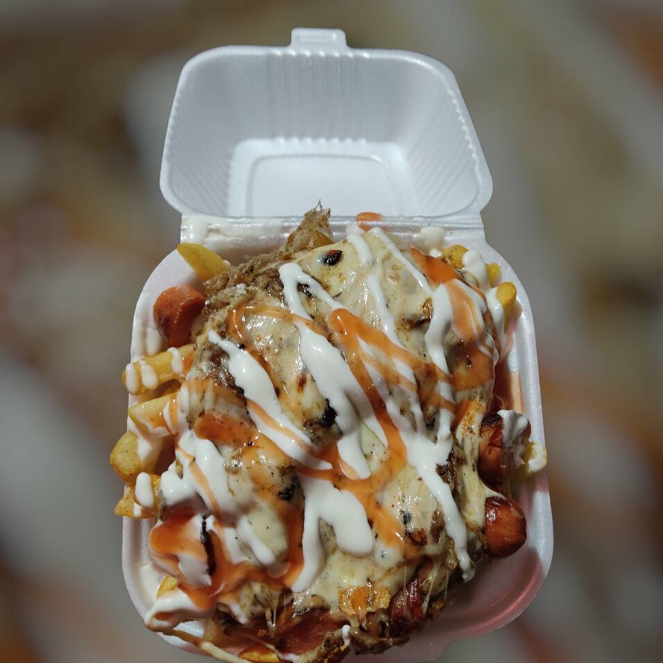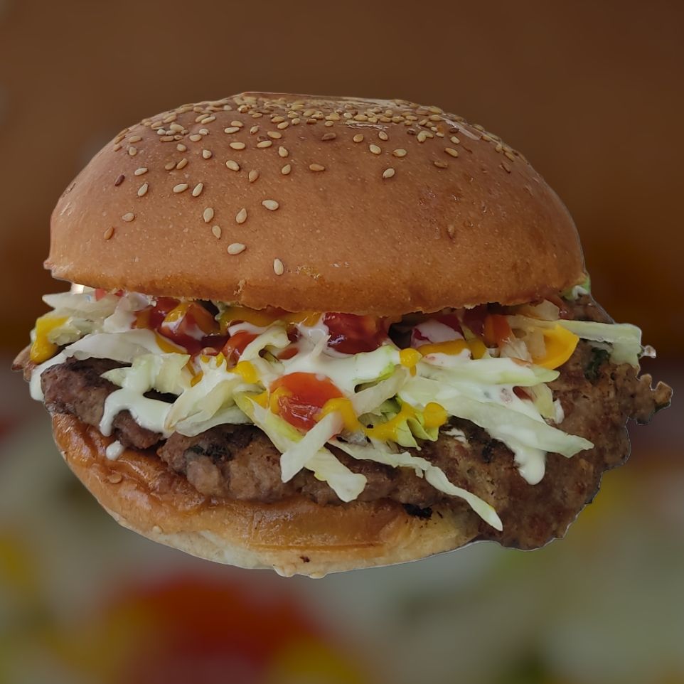 Pan de hamburguesa, carne de res, carne deshebrada, salchicha, queso blanco. Incluye papas.