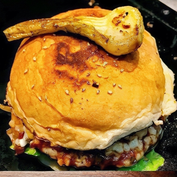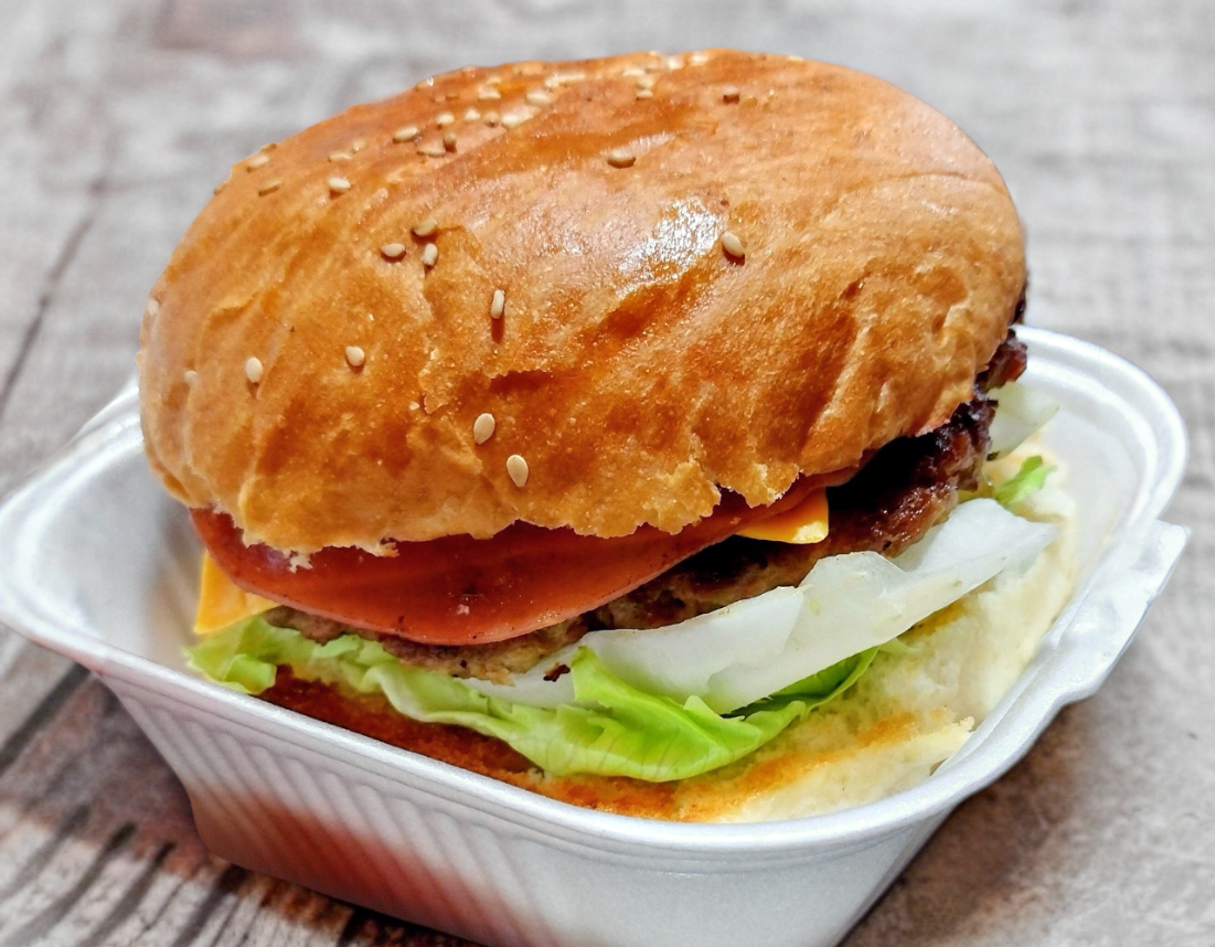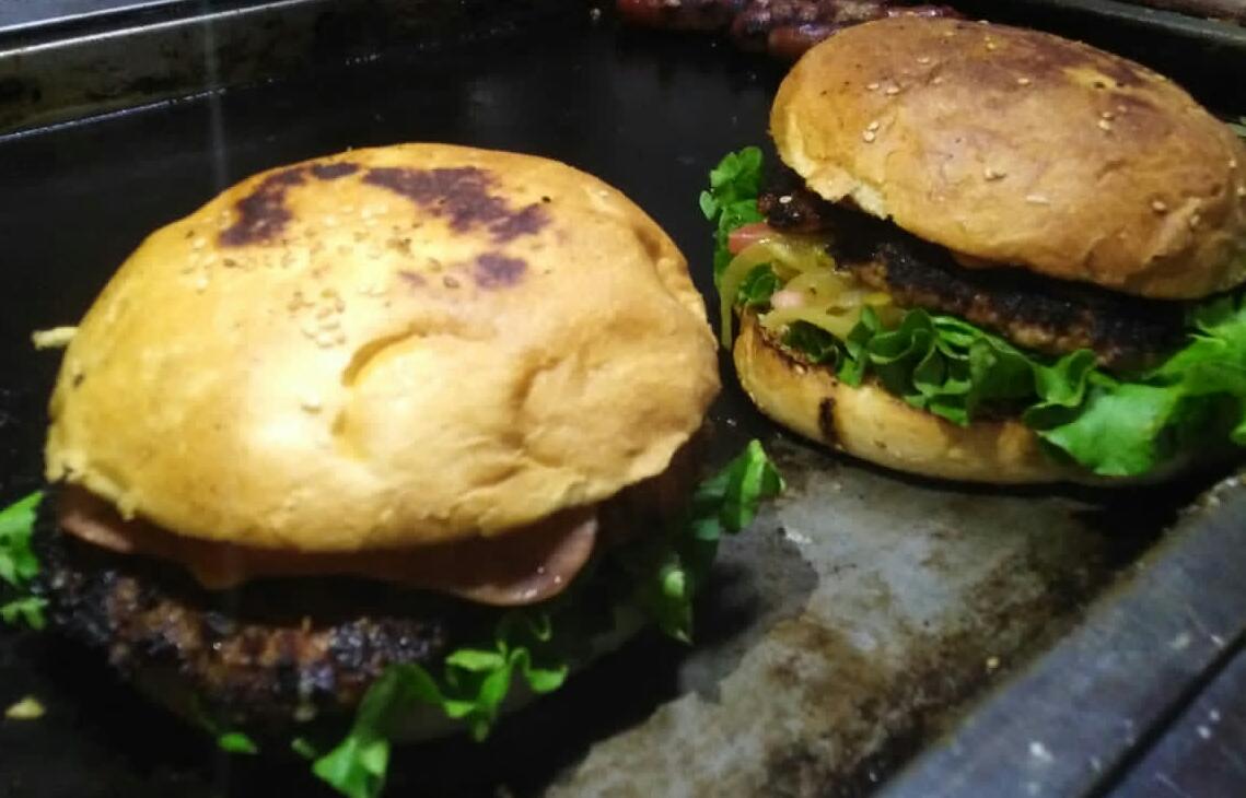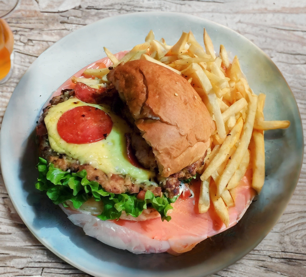Carne de res + queso amarillo + 2 salchichas c/tocino + tomate + cebolla asada o cruda + lechuga + aguacate + crema + catsup + mostaza + picante