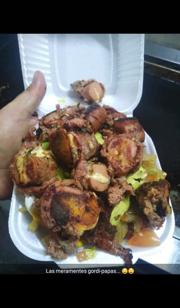 Orden de papas+2 salchigorditas(salchicha rellena de queso blanco cubierta de carne molida y envuelta en tocino) + tomate + cebolla asada o cruda + aguacate + crema + catsup + mostaza + salsa picante