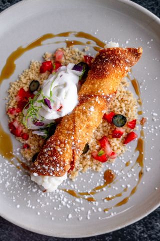 Pesca del día, cilantro, queso crema, pepino y aguacate Hoja de arroz, cebolla crunchy, togarashi, espeje de salsa