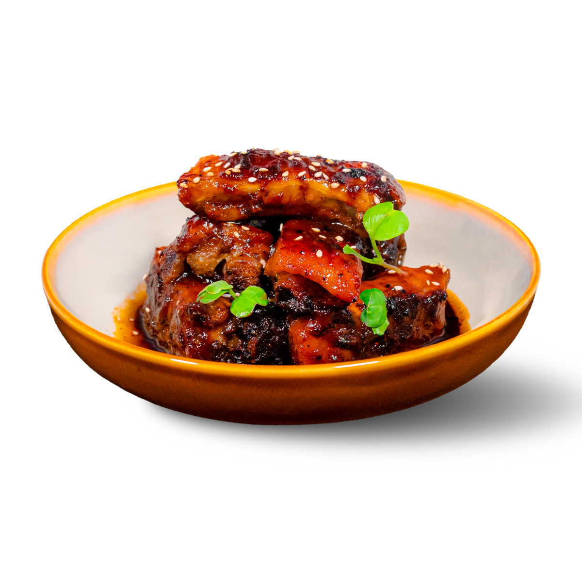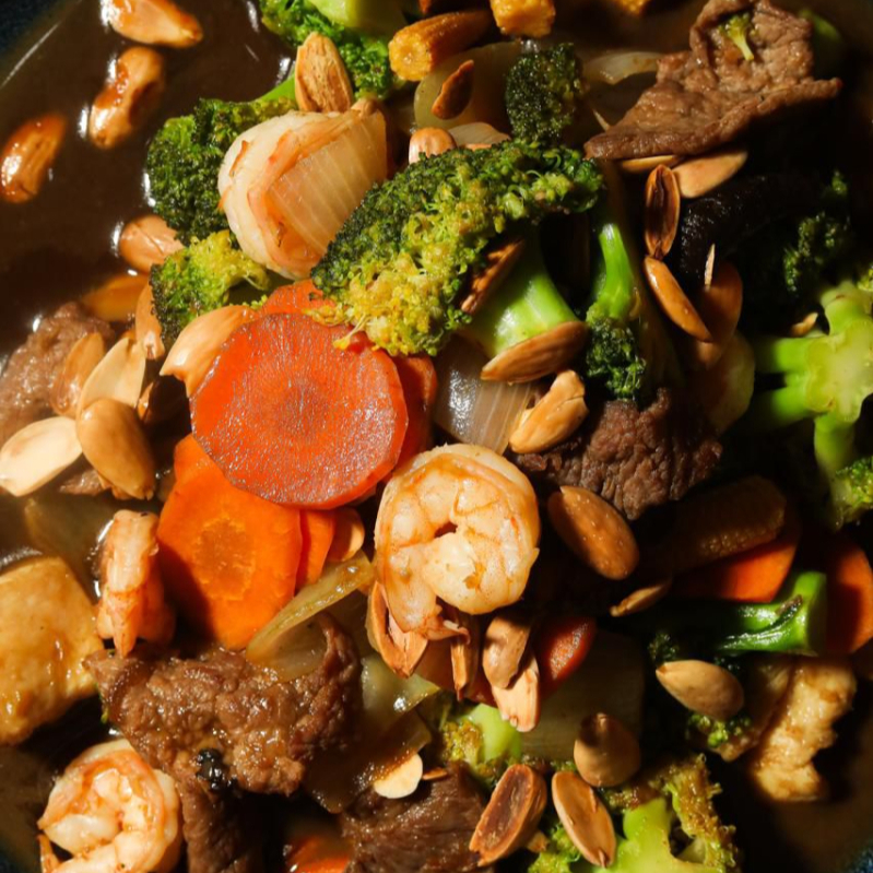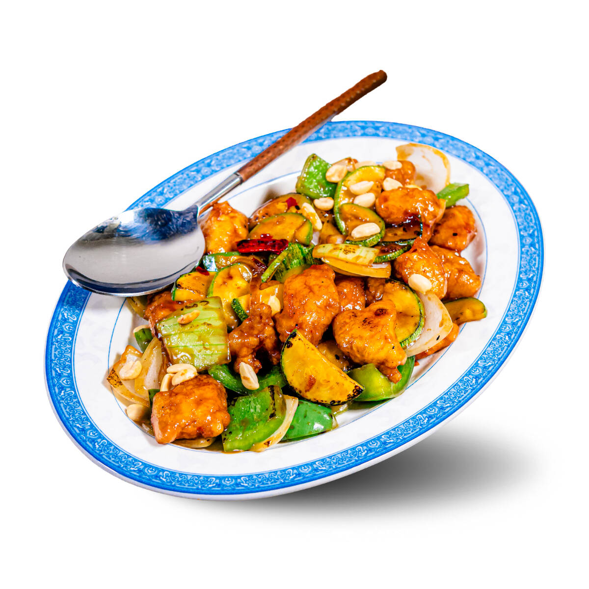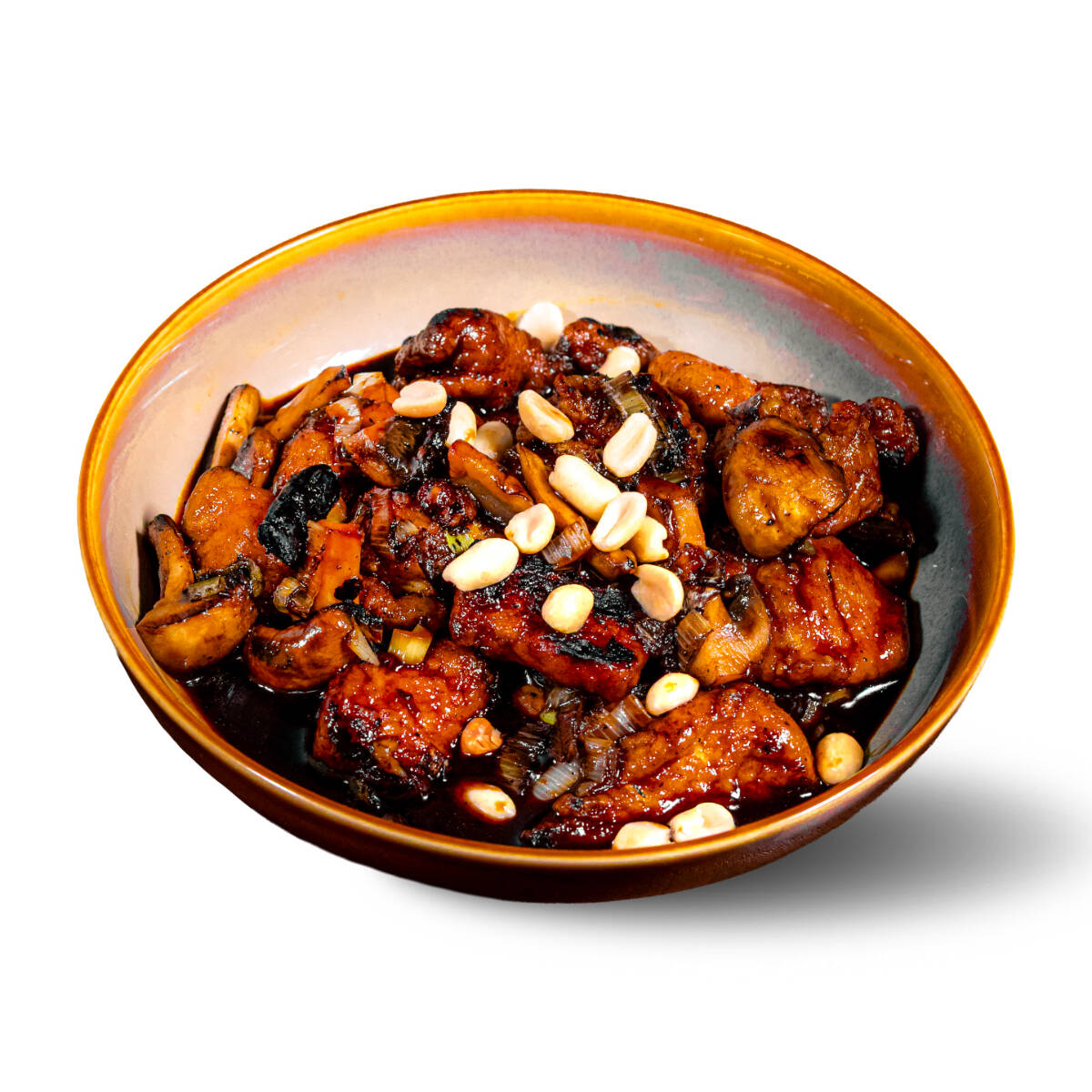 Proteína de su elección capeada, salteado al wok con cacahuate, chile seco, hongo, cebollín, una salsa intensa con notas dulces, saladas y picantes.