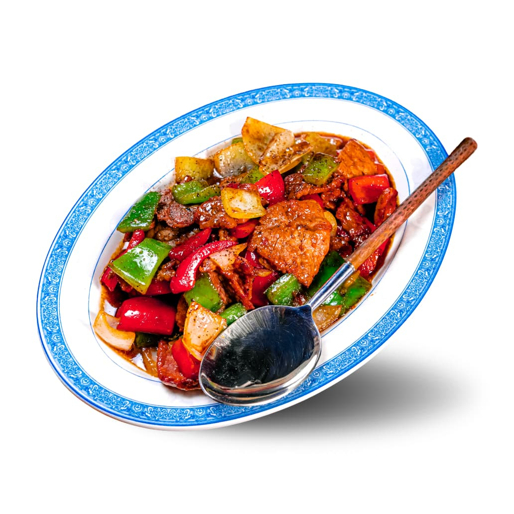 Láminas de res cocinadas en wok con pimientos rojos y verdes, cebolla, ajo y pimienta con salsa asiática.