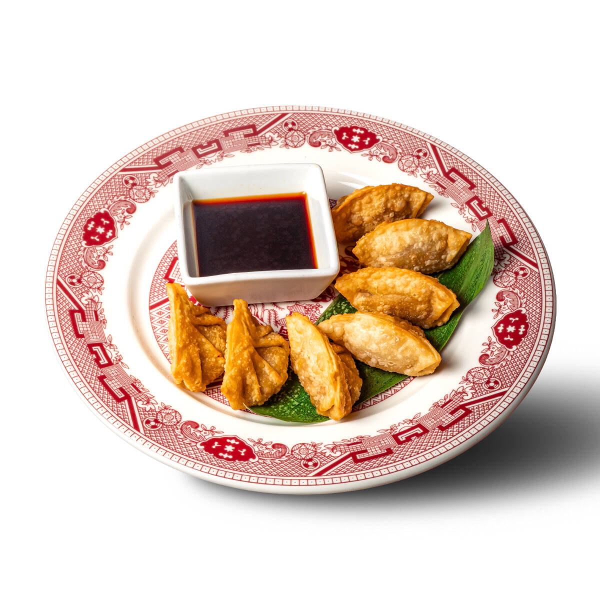 Gyozas fritas acompañado con chili oil con tu proteína de elección