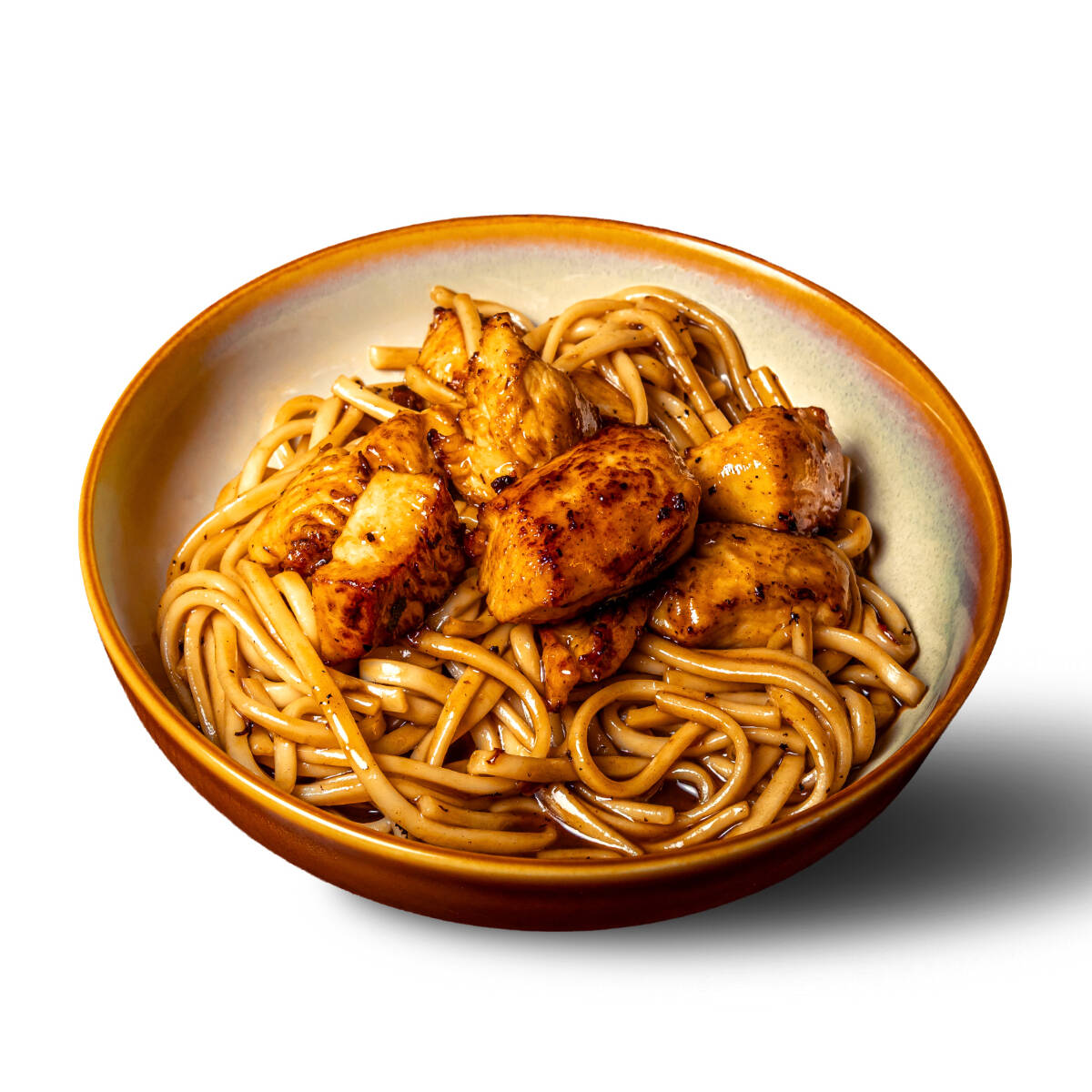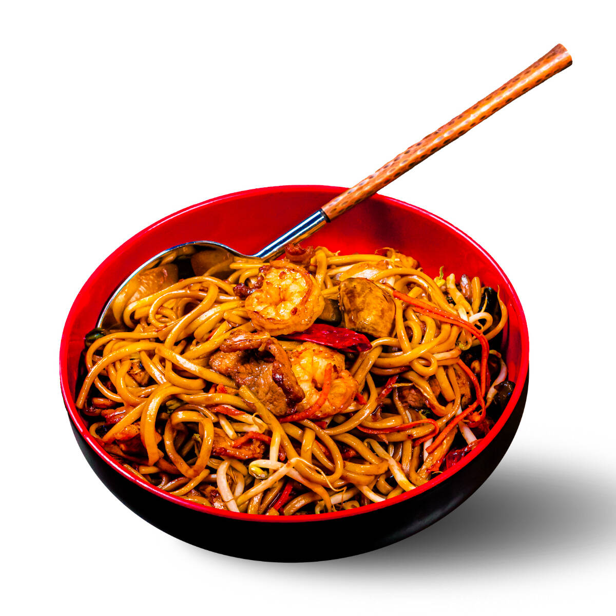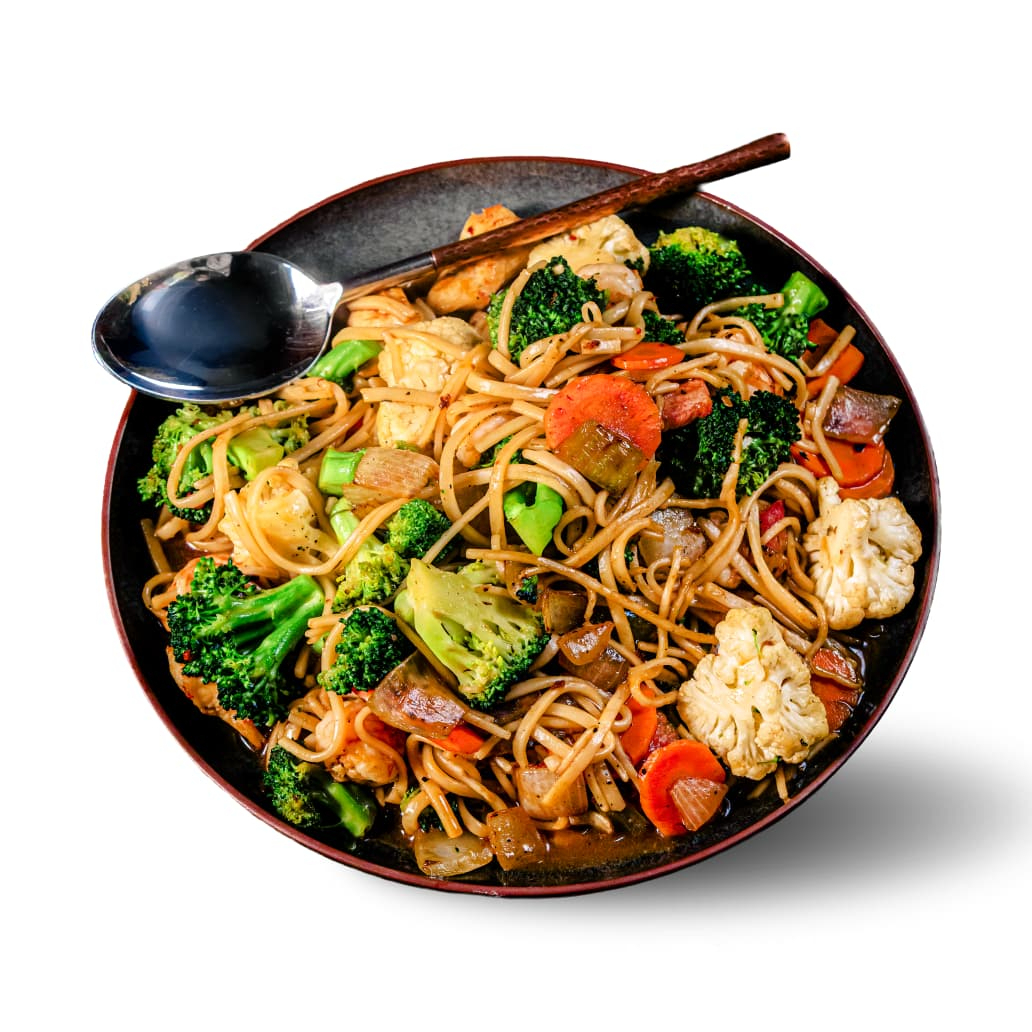 Noodles con proteína de tu elección salteados con cebolla, frijolillo, zanahoria, chile de árbol y salsa asiática.