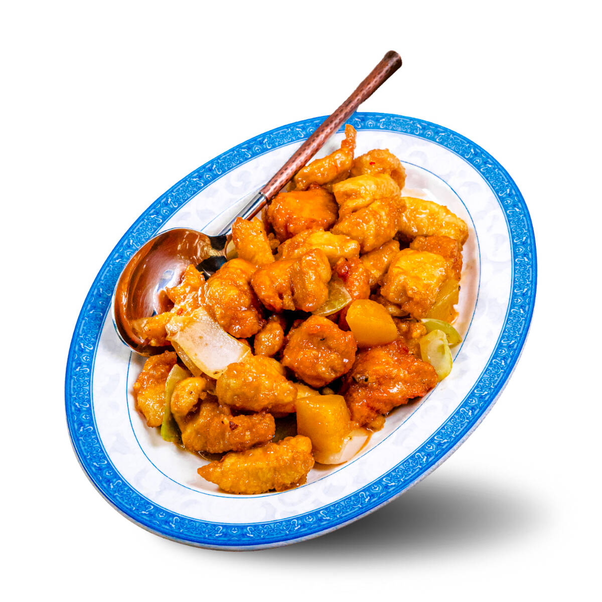 Crujientes trozos de pollo bañados en salsa piña de inspiración oriental.
