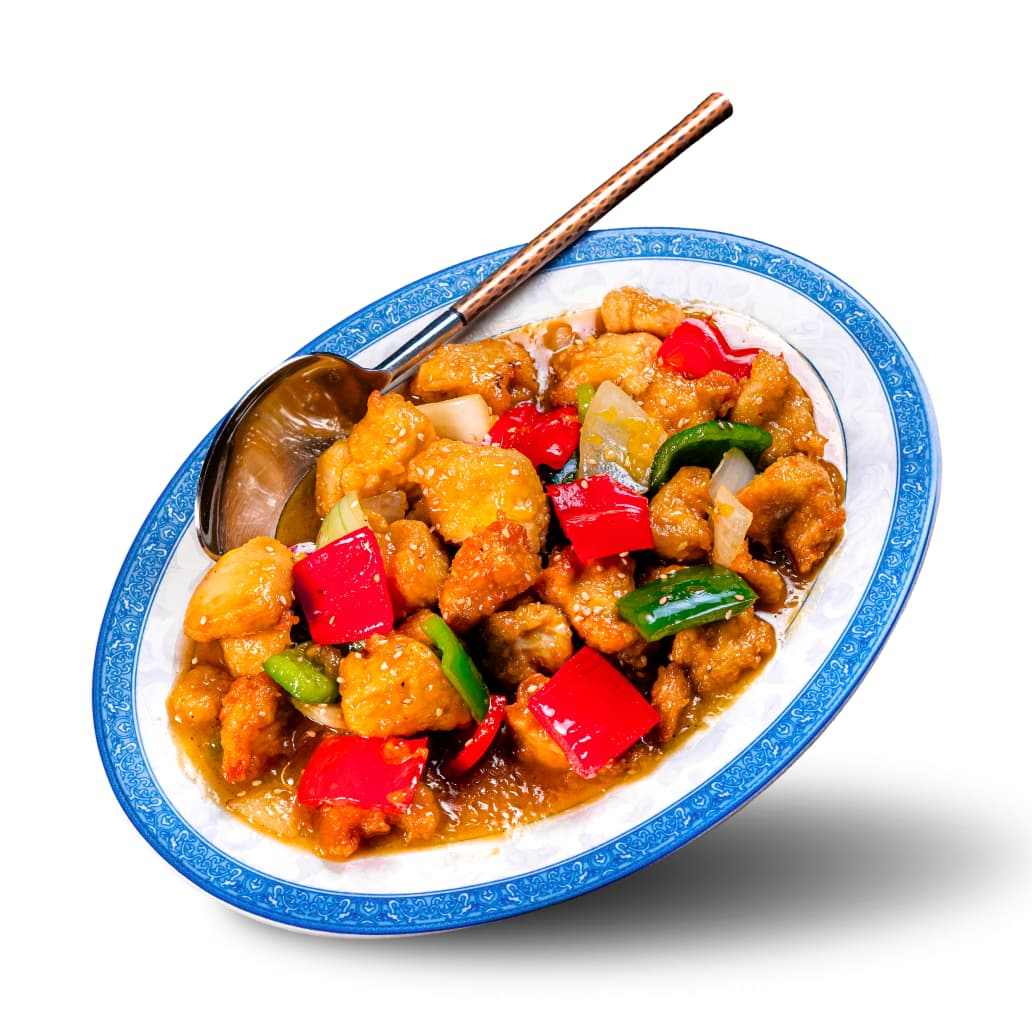 Pollo crujiente en salsa agridulce de naranja con cebolla, pimientos rojo y verde.