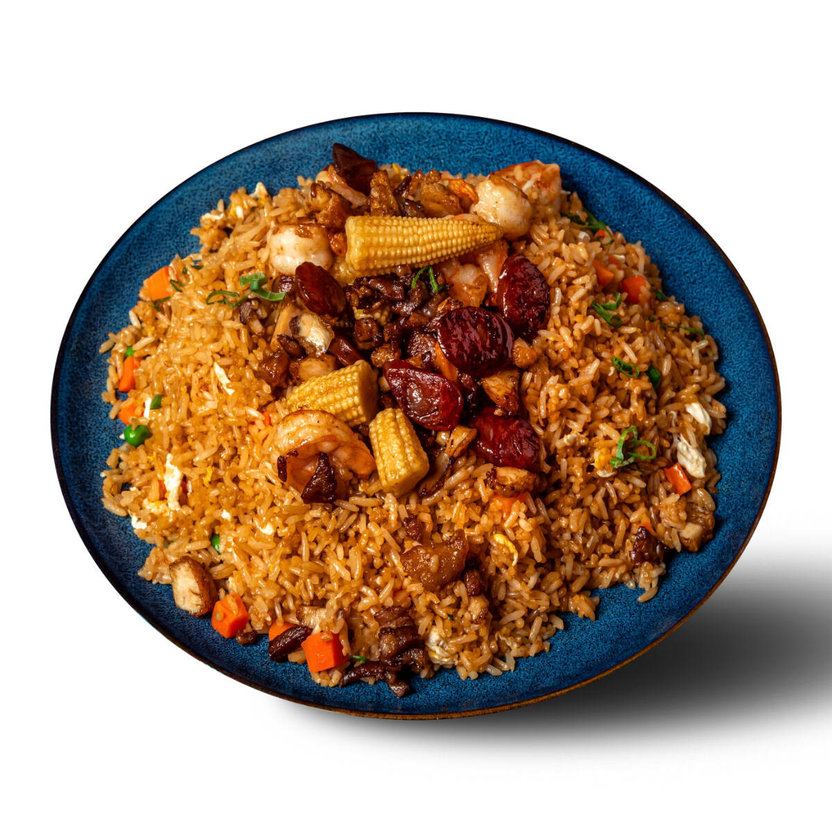 Arroz frito, huevo, verduras, salchicha China y elote baby. Proteína a elegir.