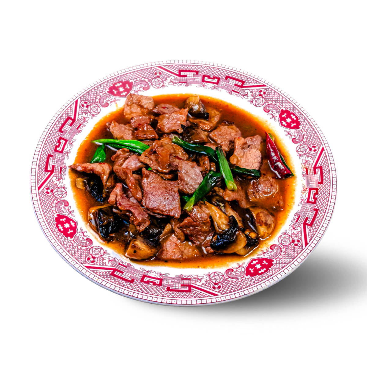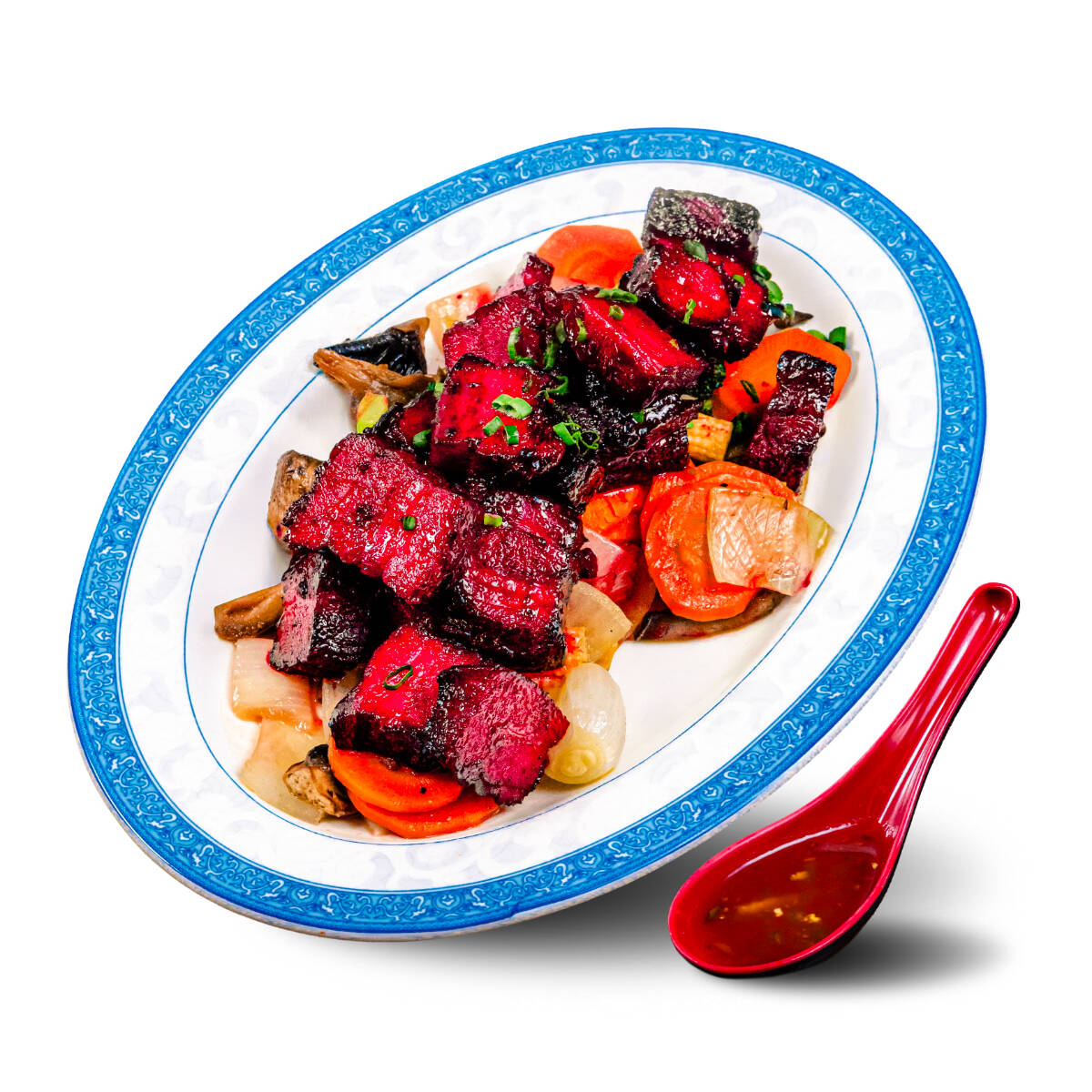 Res salteada al wok con zetas, cebollín y chile de árbol en salsa asiática.