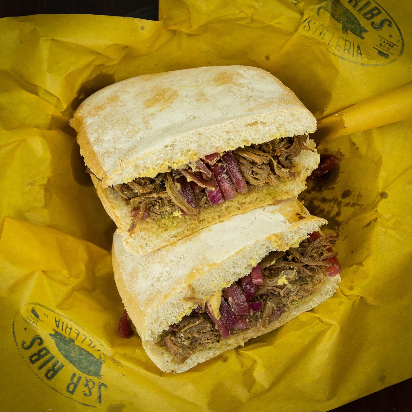 Nuestras famosas costillas Baby-Back en un sándwich de pan chapata horneado localmente (180gr).