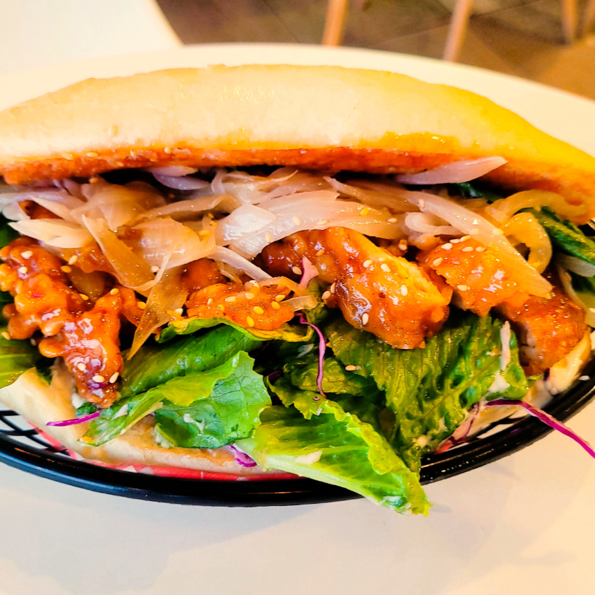 Reinterpretacion de "Chicken Burger" Coreano mejorado en estilo Mexicano. Torta con K-Chicken, ensalada, cebolla a la parrilla y mayo