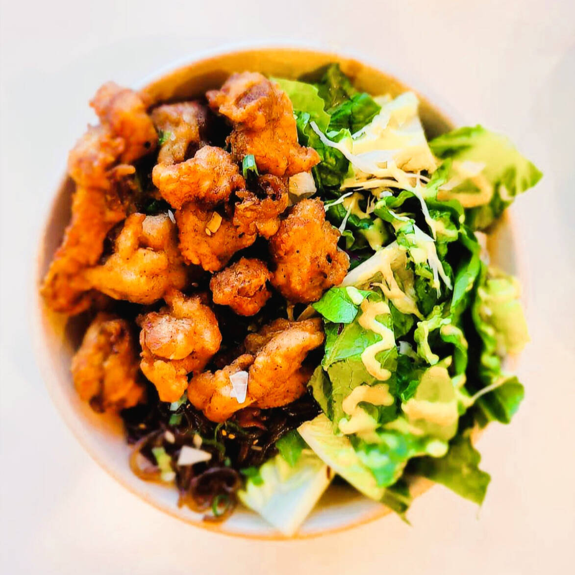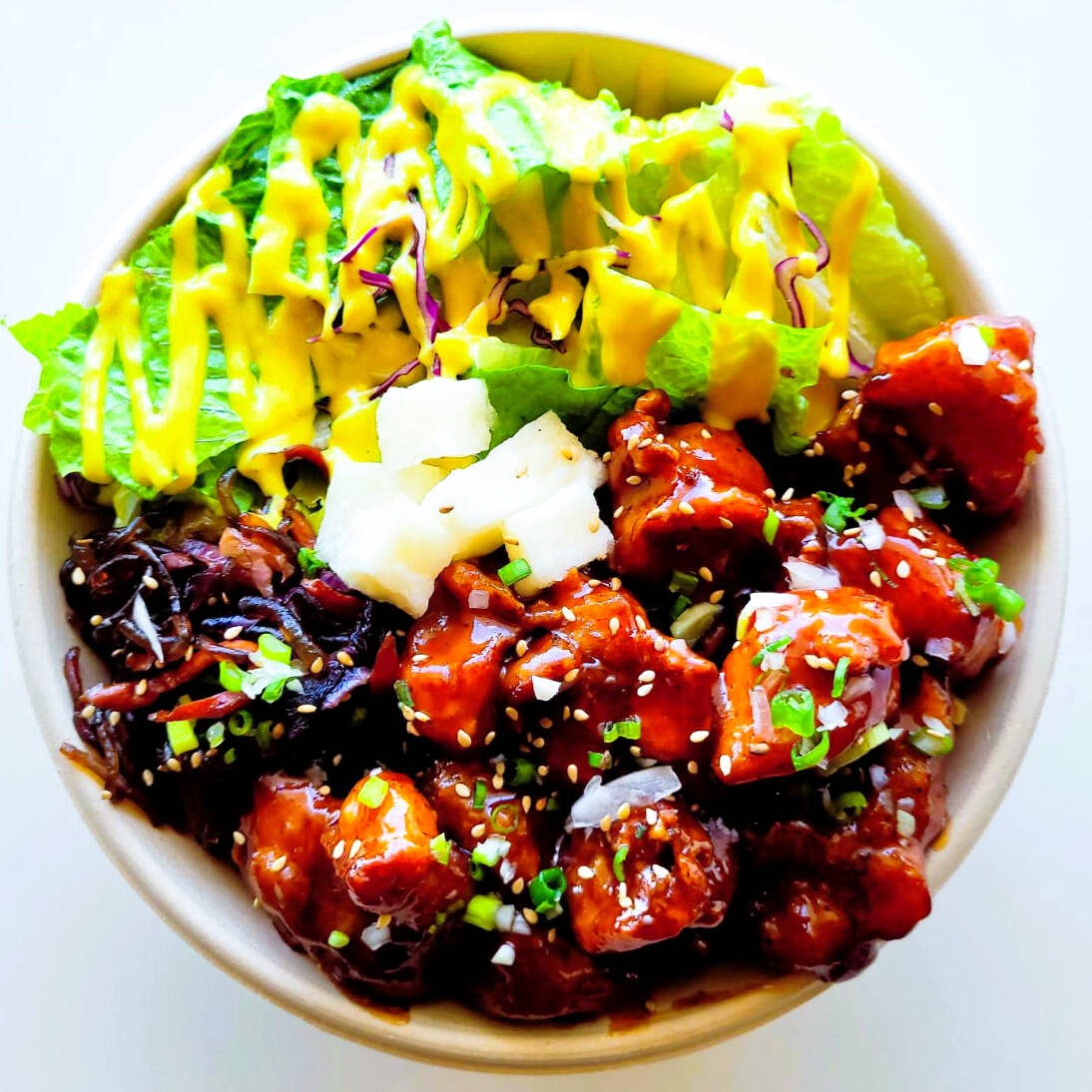Pollo frito en salsa pica dulce estilo Coreano en cama de arroz, ensalada, fideo de camote.