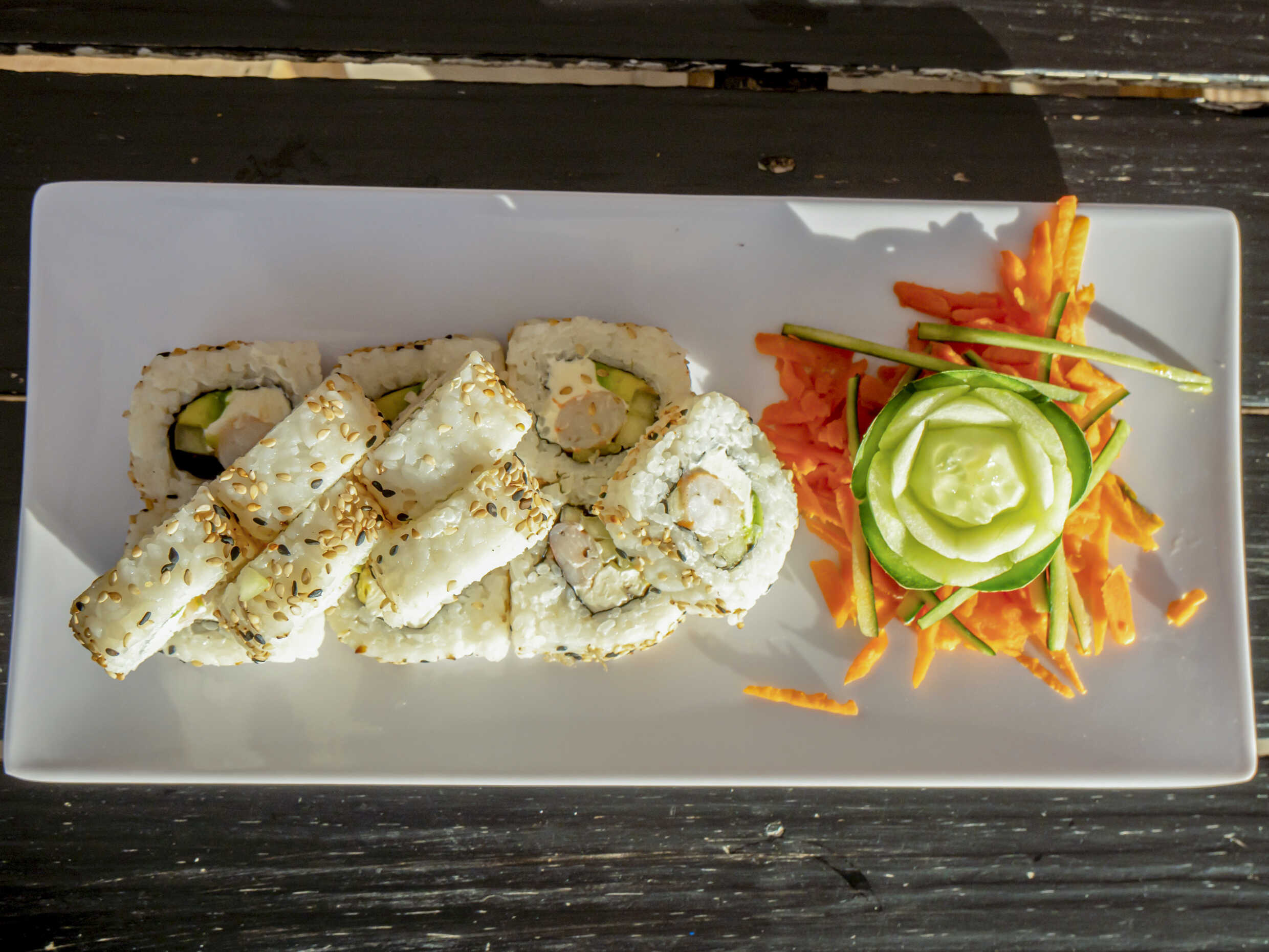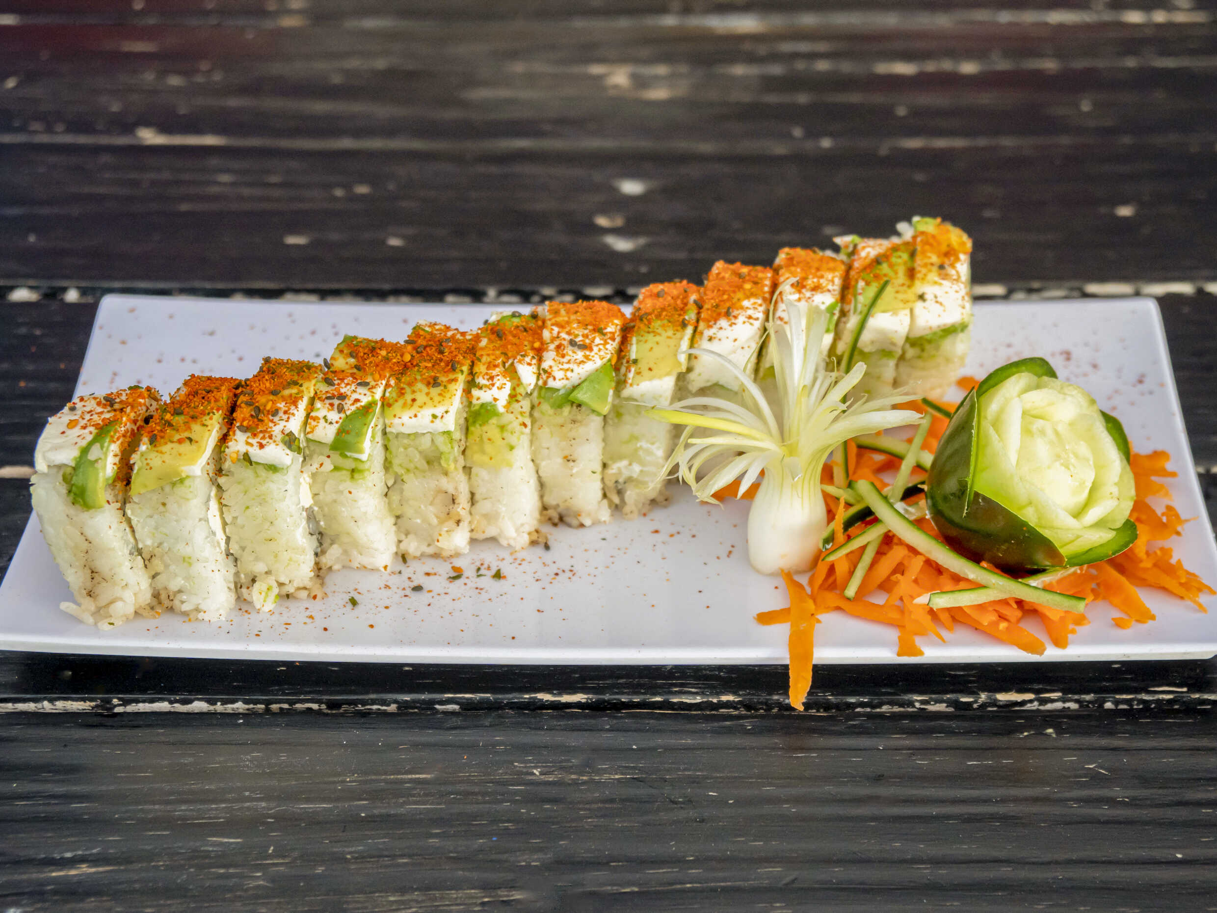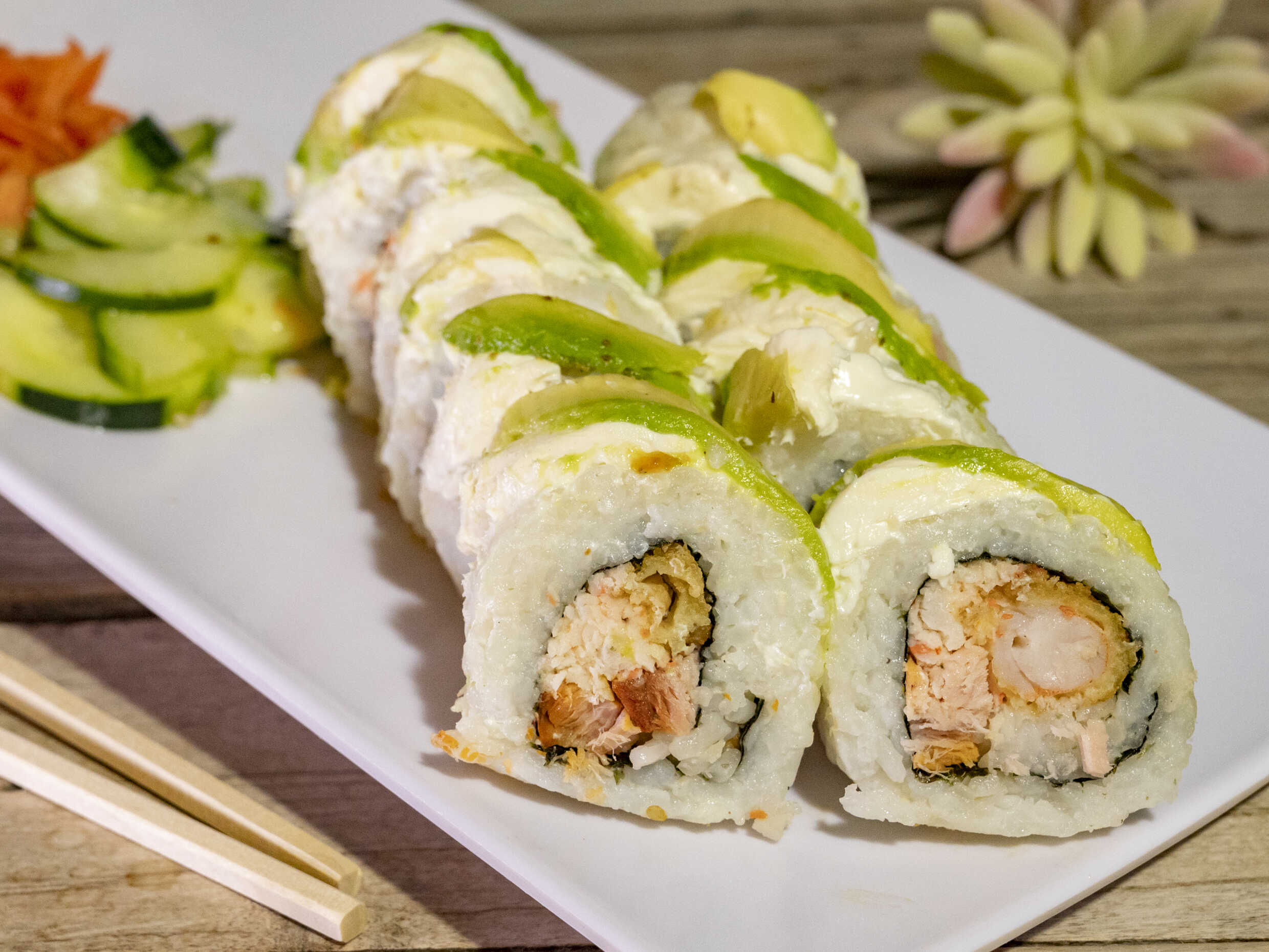 Camarón, pepino y queso crema, por fuera aguacate, tampico y salsa anguila.