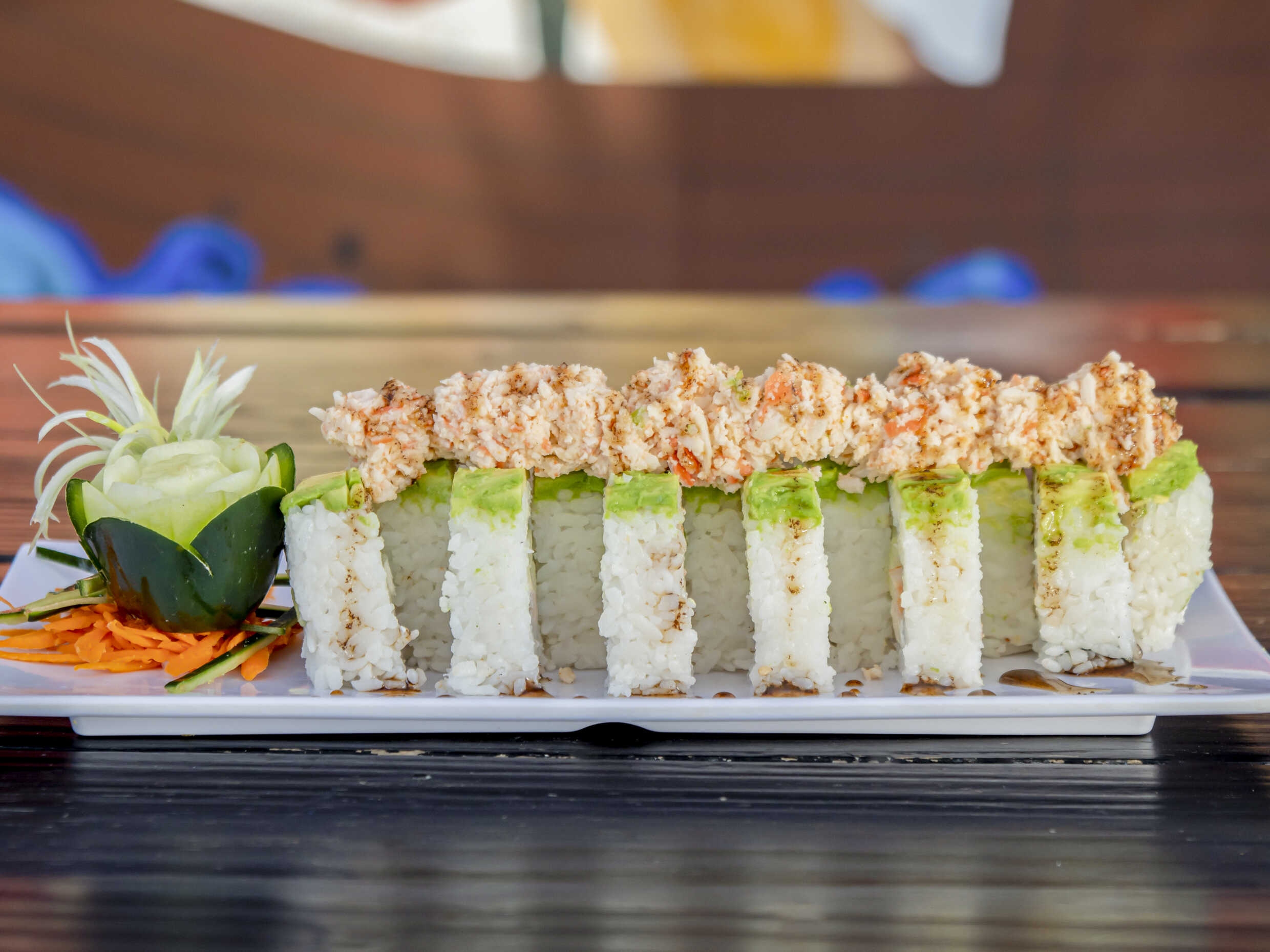 Mariscos de la barra por dentro queso crema, aguacate, masago, cebollín, ajonjolí y salsa anguila por fuera.