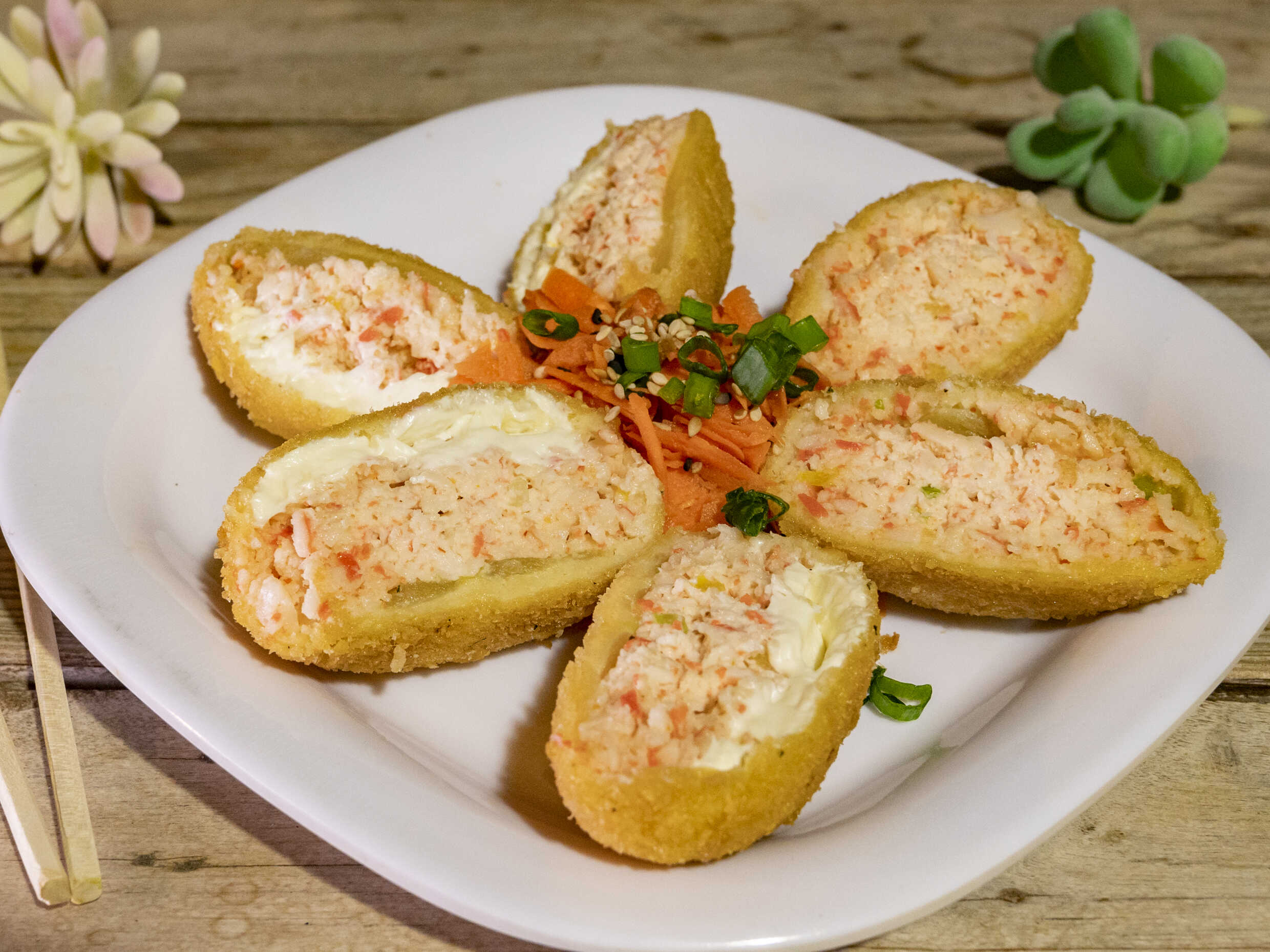 Bola de arroz empanizado, rellena de pollo, res, aguacate, queso crema y tampico.