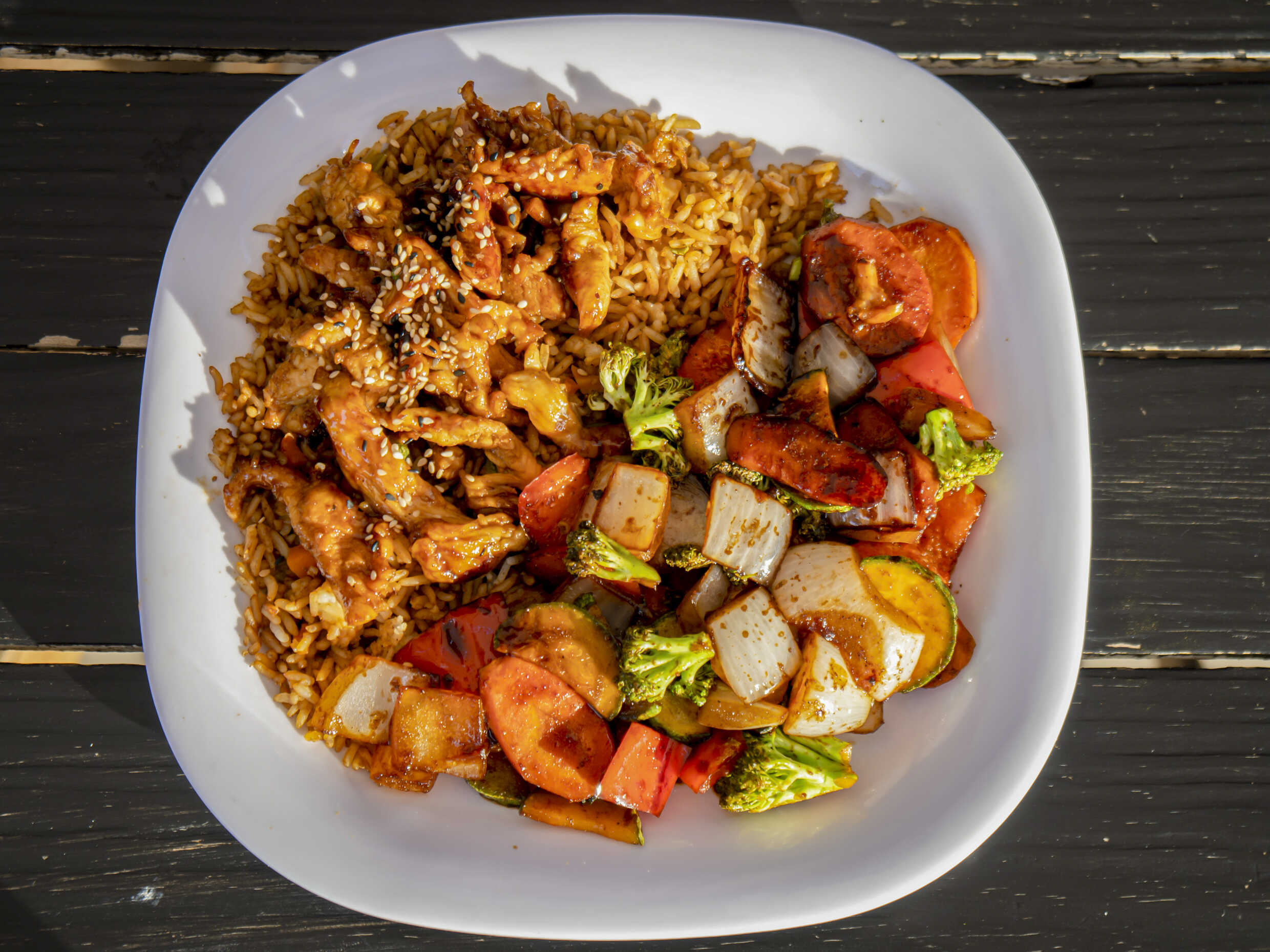 Verduras salteadas con pollo o pescado en salsa de ostión, montado en cama de arroz al vapor.