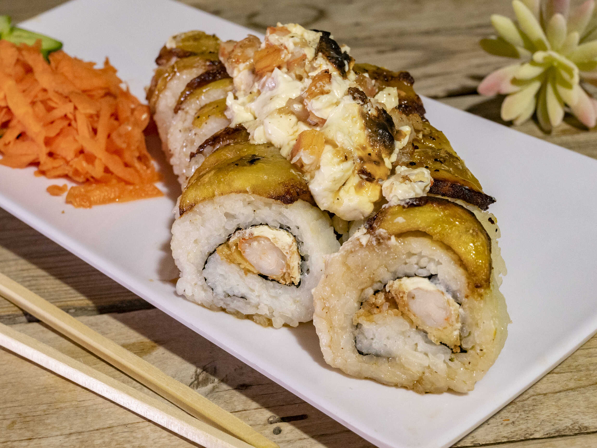 Camarón tempurado, marlín ahumado y kanikama por dentro, por fuera queso crema, aguacate, pulpo capeado y salsa anguila.