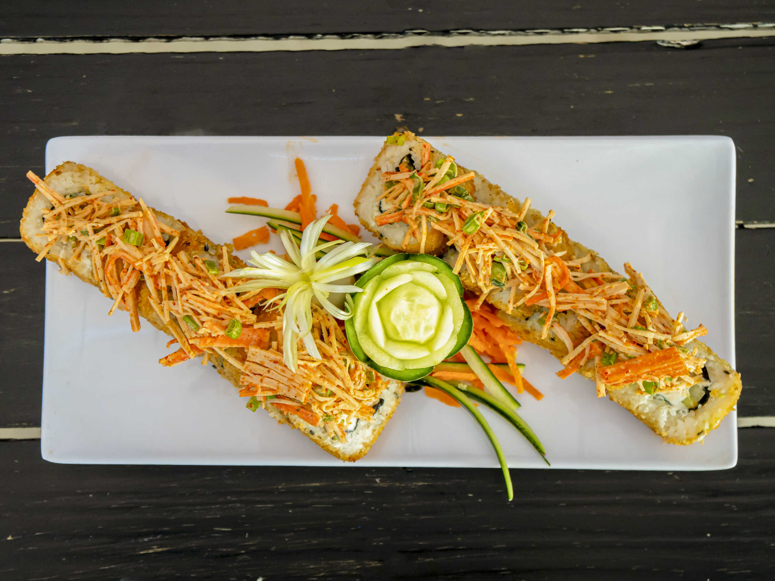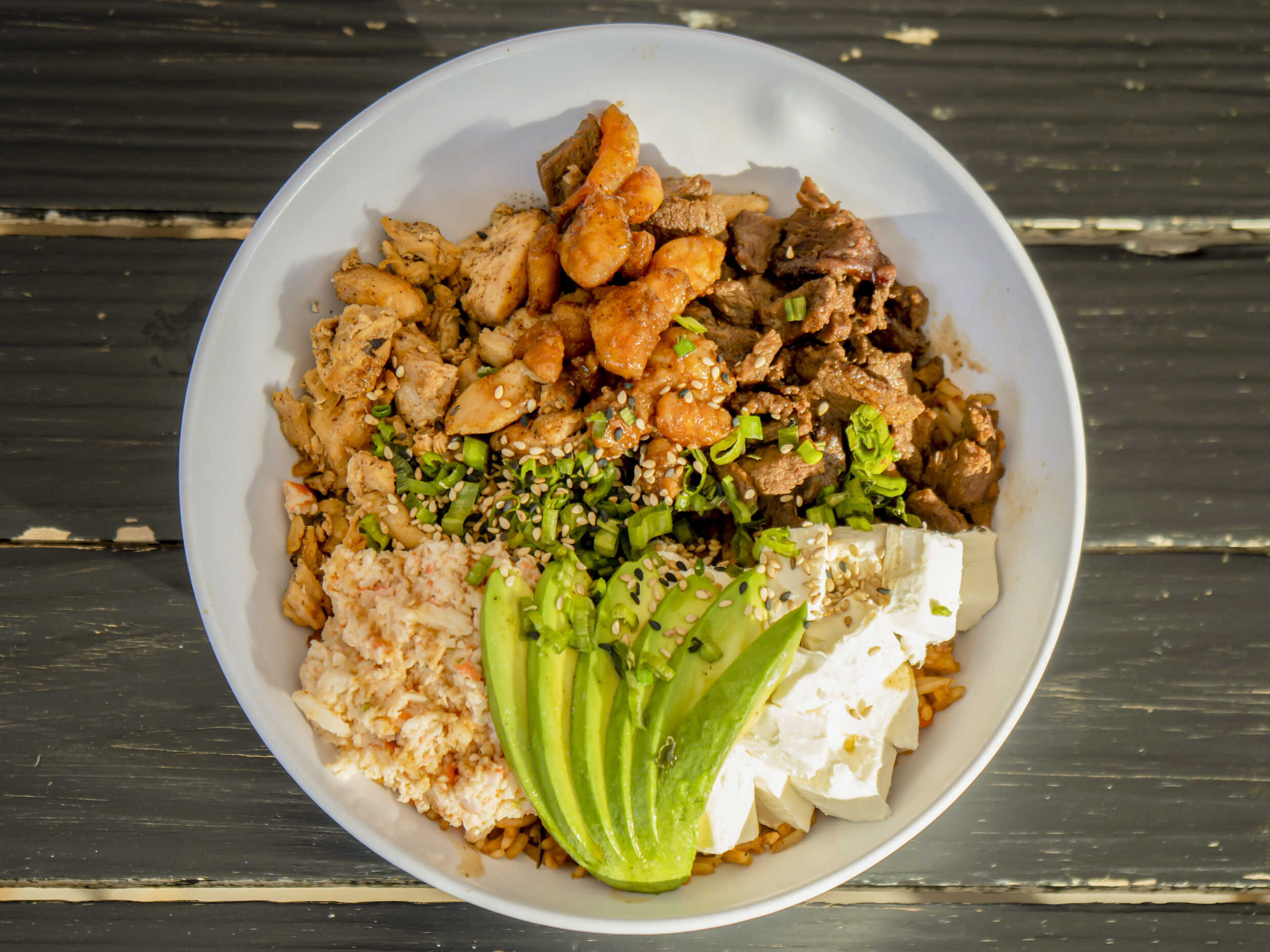 Cama de arroz frito con verduras, pollo, res y surimi empanizado, con aguacate, queso crema y tampico.