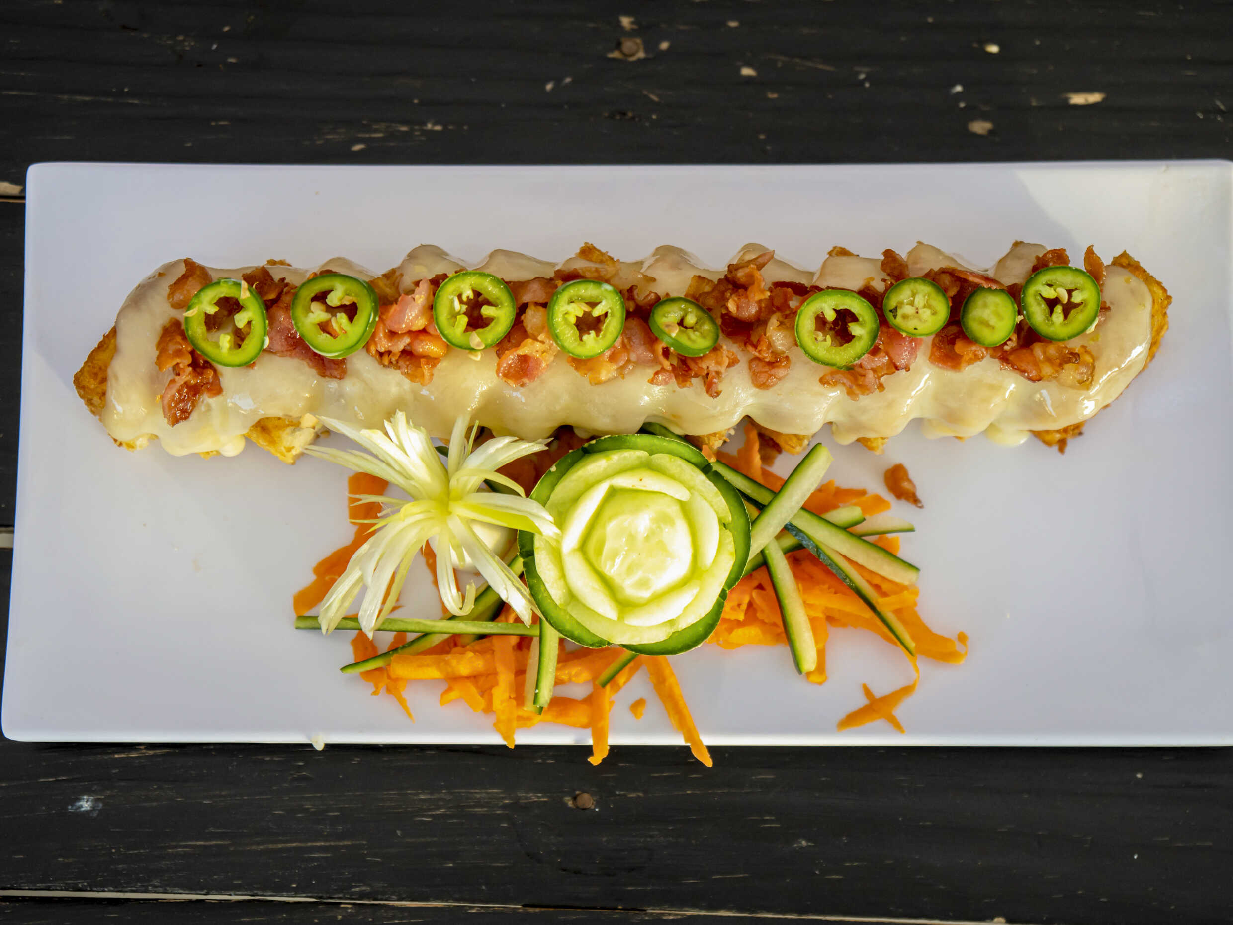 Camarón tempurado, queso crema, aguacate y tocino, por fuera gratinado y tampico.