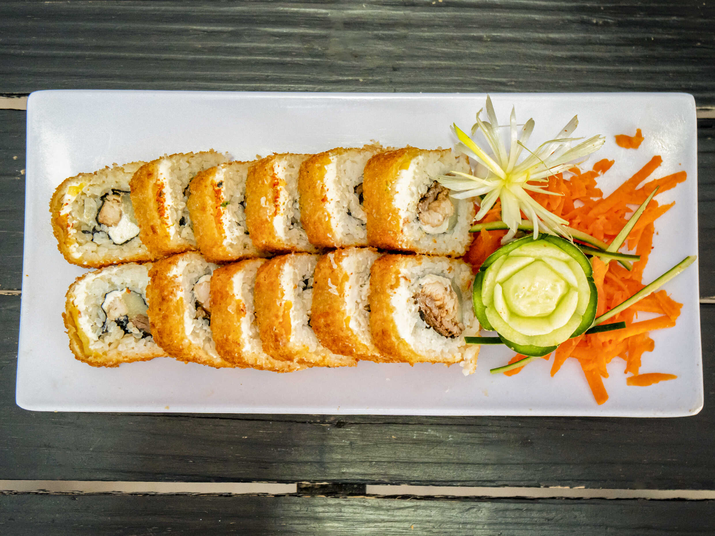 Marlín ahumado, camarón empanizado y tampico, por fuera queso crema y aguacate.