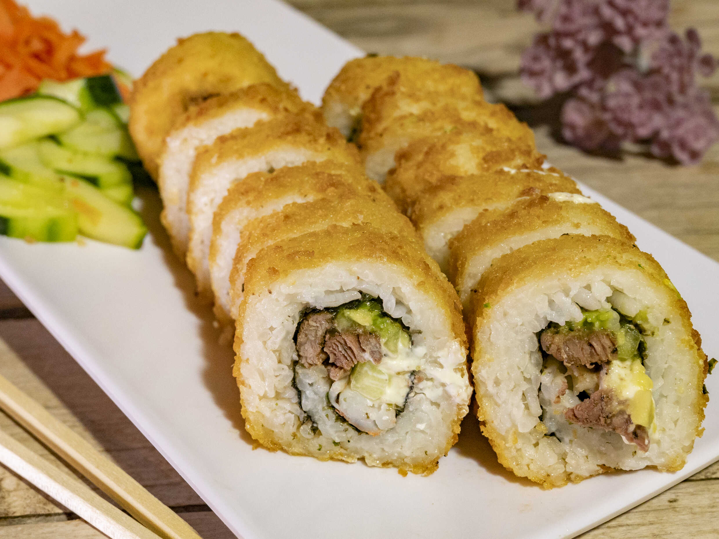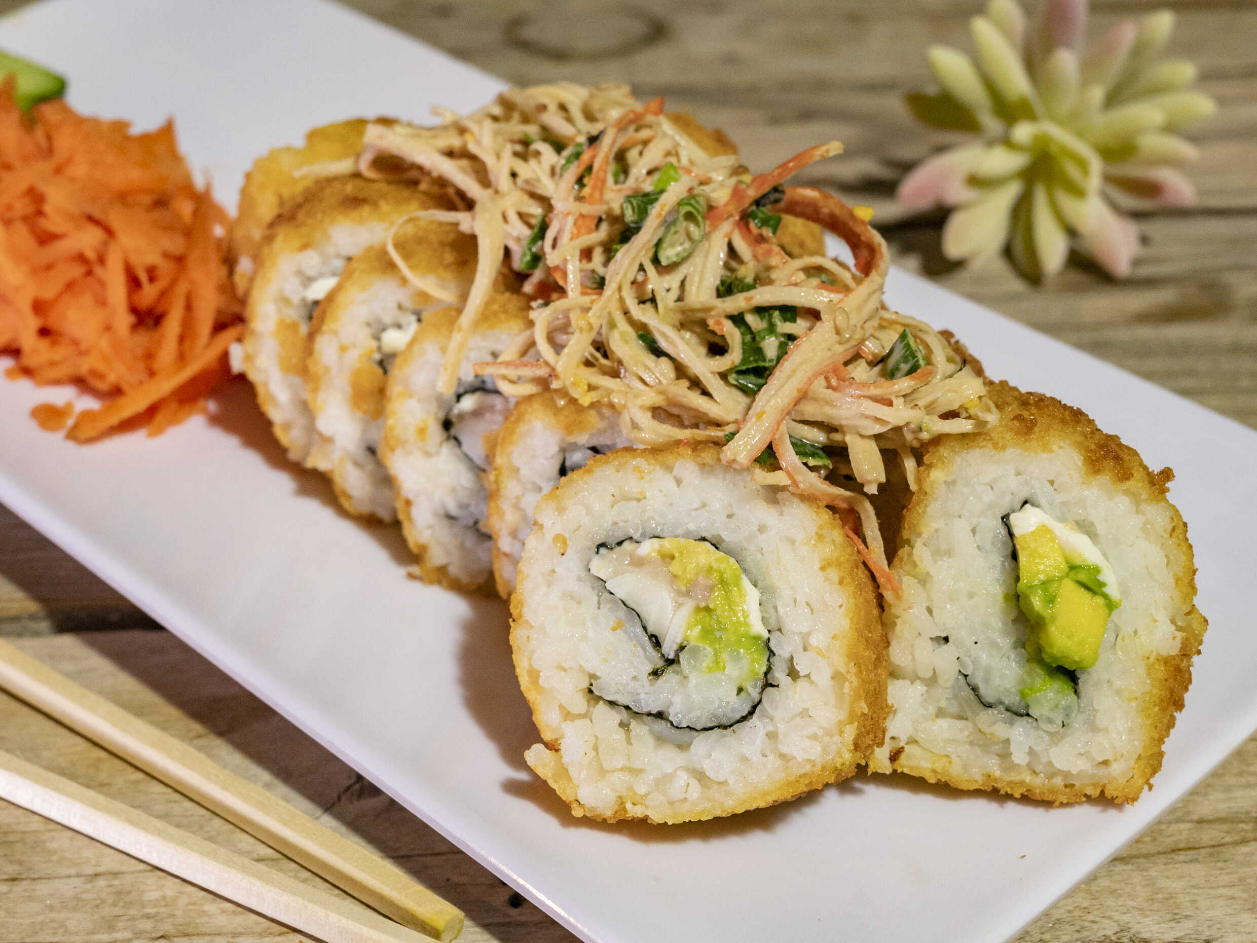 Res, surimi empanizado y queso crema, por fuera aguacatem cebollín, ajonjolí y salsa anguila.