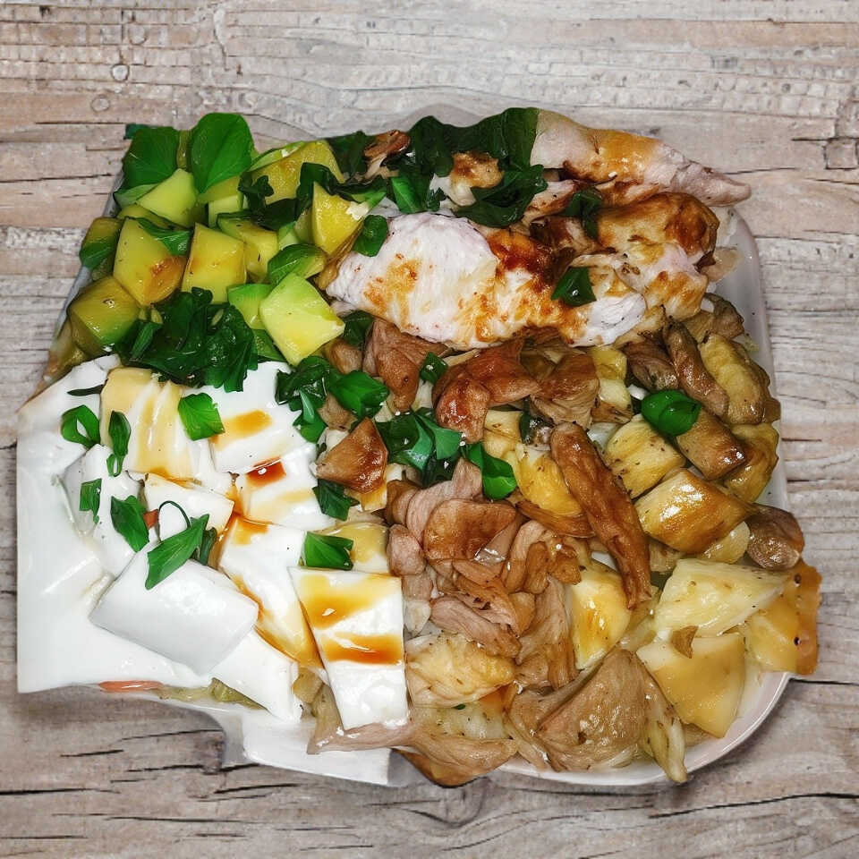 Queso crema, aguacate, tampico, res, pollo taurino y pollo empanizado (es grande ).