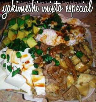 Arroz frito con pollo empanizado queso crema, aguacate, tampico y tocino.