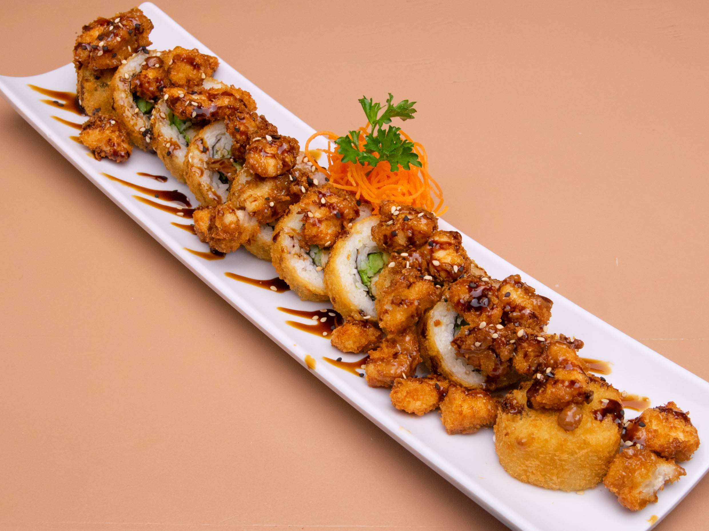 camarones en tempura crujiente, bañado de nuestro aderezo spicy y salsa anguila, montados sobre una cama de arroz blanco.
