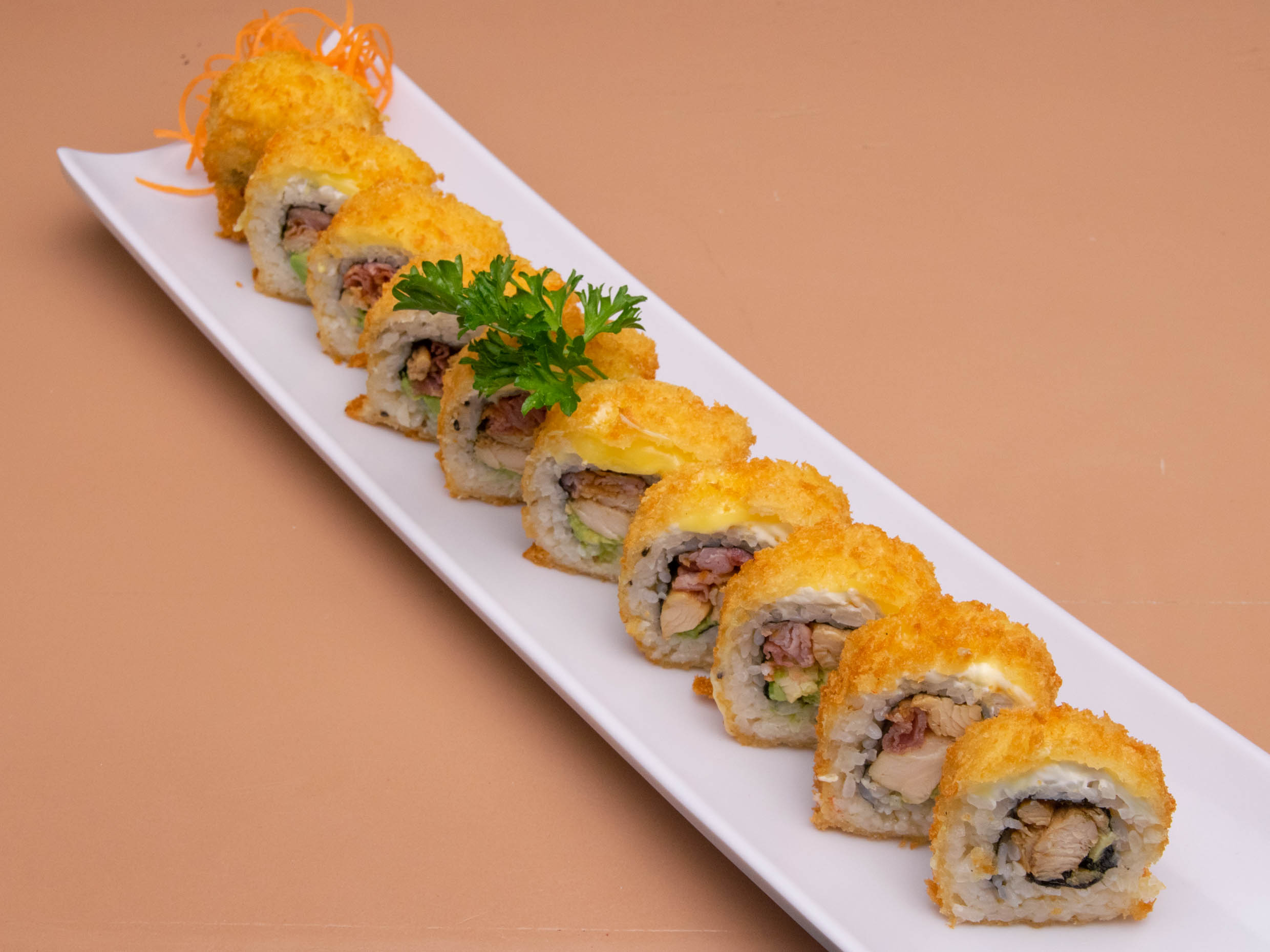 Laminas finas de pescado rellenas de nuestro kanikama especial y aguacate, bañado con aderezo de naranja y toque de salsa serranito