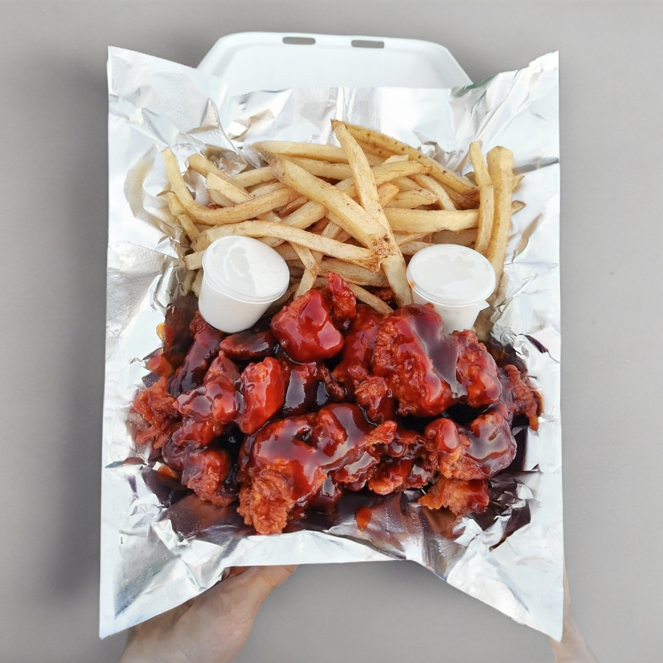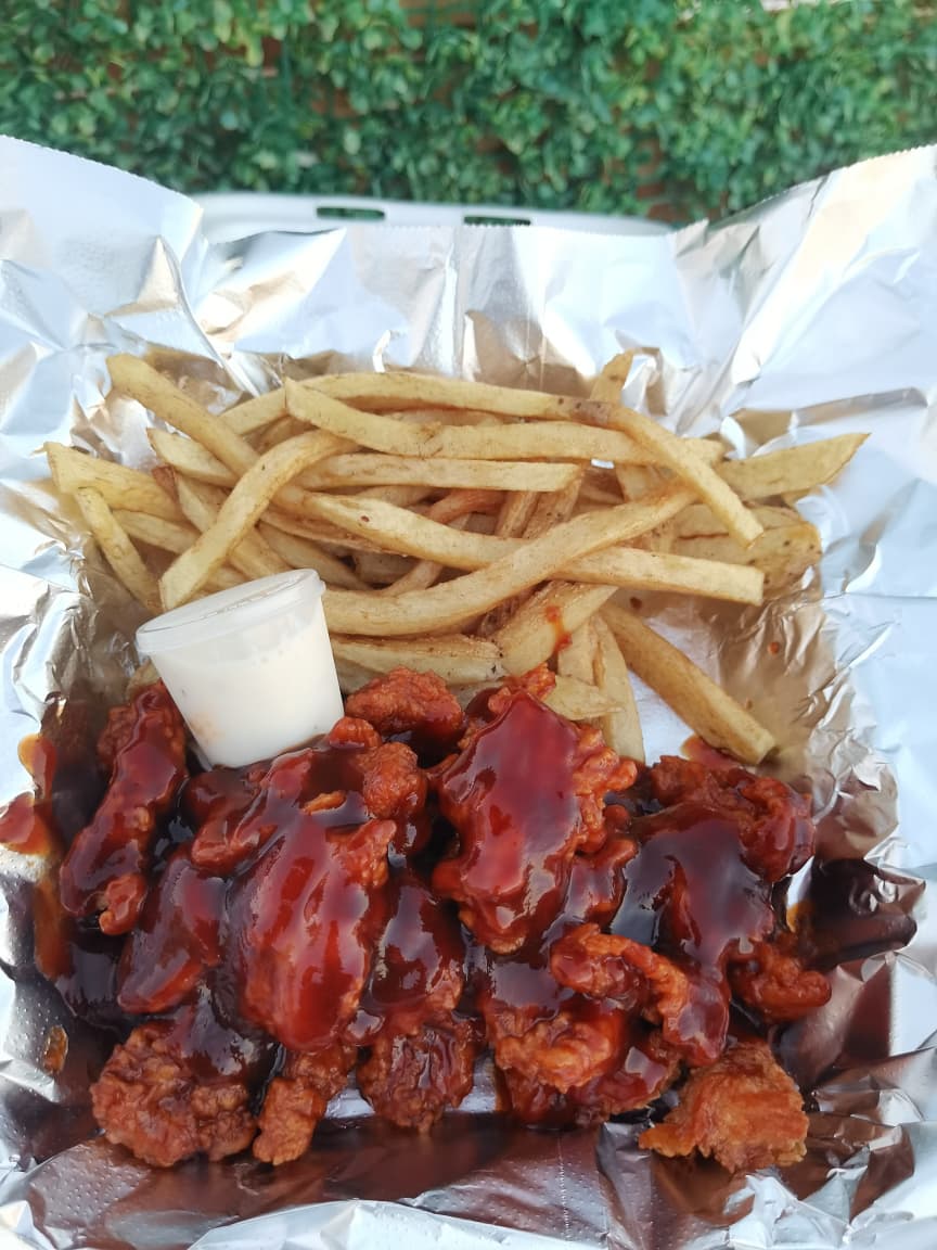 390 g De boneless en salsa de tu elección acompañado de papas y ranch.
