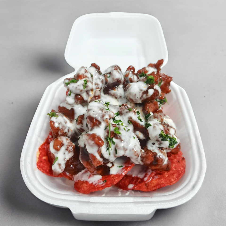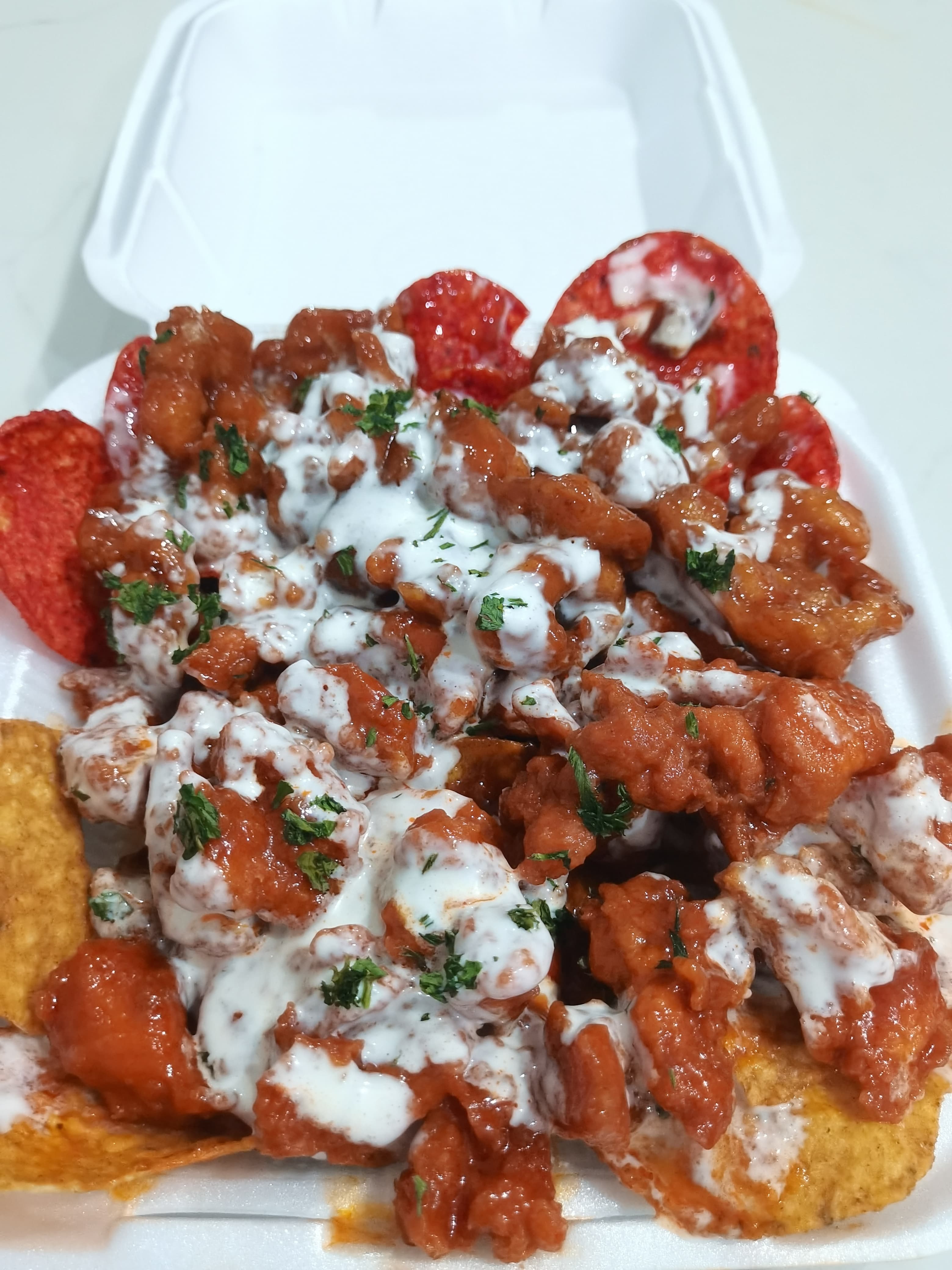 130 g De boneless en salsa de tu elección con una cama de tostitos y papas fritas, acompañada de aderezo ranch
