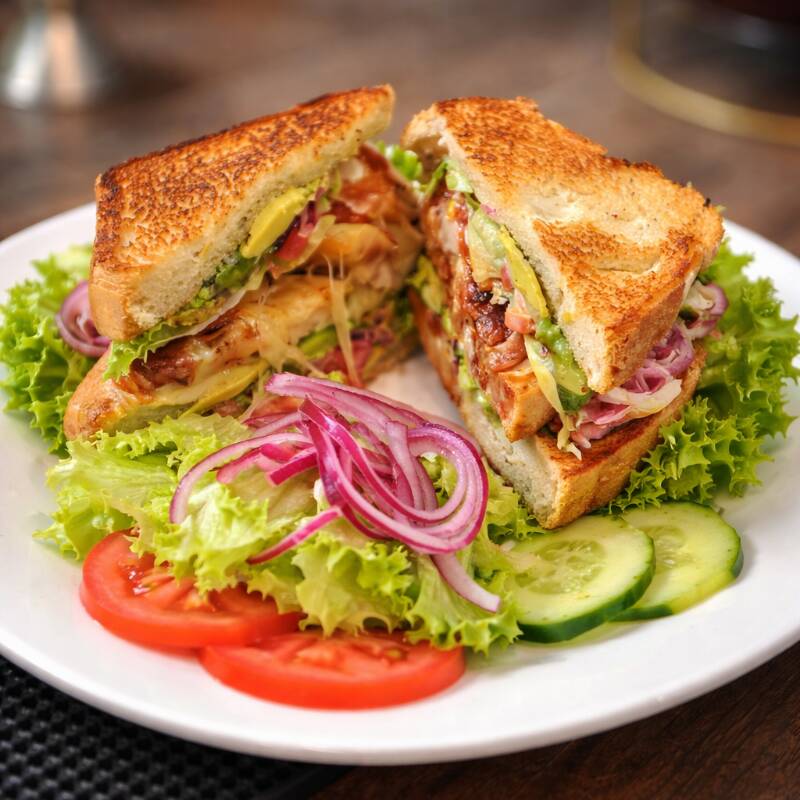 Clásico y abundante sándwich de tres capas, preparado con pan dorado a la mantequilla, jugosa pechuga de pollo, jamón, tocino crujiente, queso derretido, lechuga fresca, tomate y aderezo especial. Servido en porciones perfectas para disfrutar cada bocado lleno de sabor. Ideal para quitar el hambre con estilo.