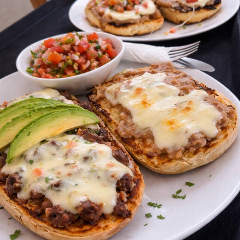 Pan crujiente recién horneado, cubierto con una base de frijoles refritos y generosa capa de queso gratinado, acompañado de chorizo doradito lleno de sabor.