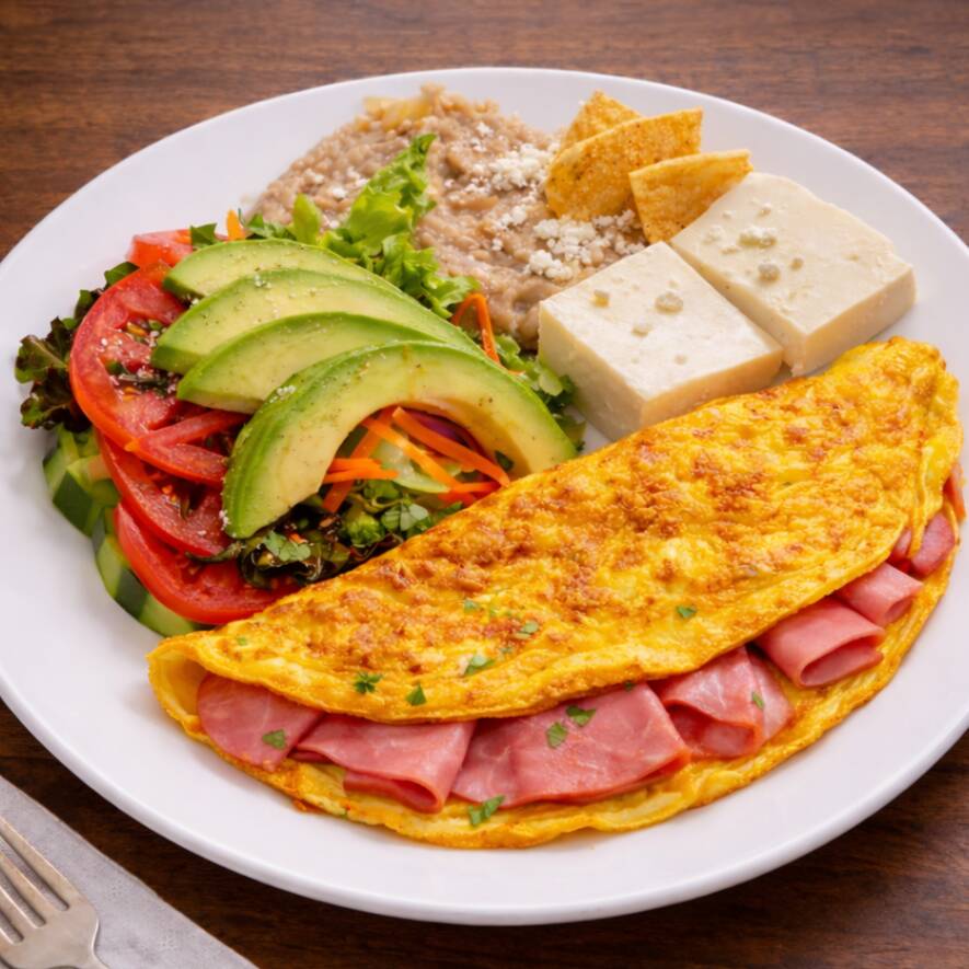 Esponjoso omelette recién hecho, relleno de jamón doradito y queso fundido que se derrite en cada bocado. Preparado a la mantequilla para un sabor suave y cremoso, acompañado de guarniciones frescas que lo hacen el desayuno perfecto, clásico y delicioso.