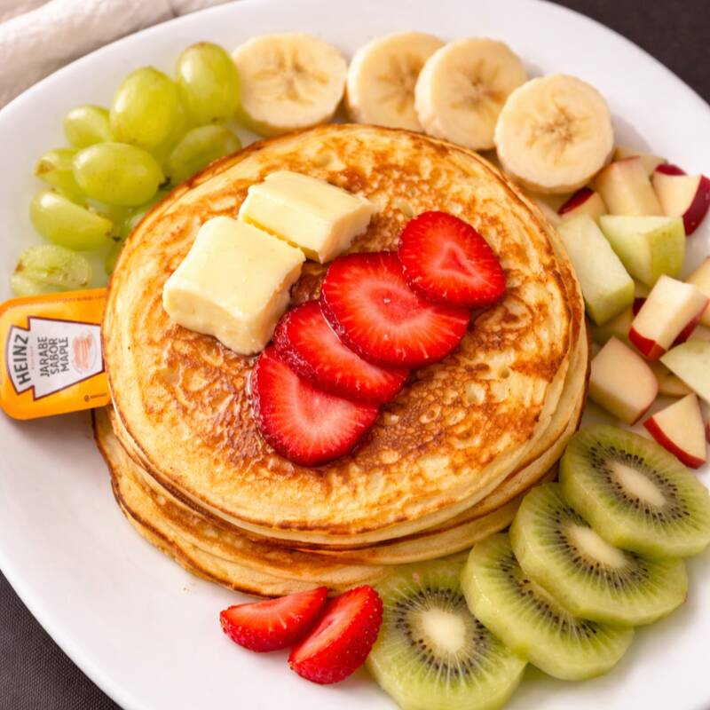 Suaves y esponjosos hot cakes recién hechos, acompañados de fruta fresca de temporada que aporta un toque natural y refrescante. Servidos con mantequilla y un ligero toque de miel o jarabe, creando el equilibrio perfecto entre dulzura y frescura. Un clásico irresistible para empezar el día con un antojo dulce.
