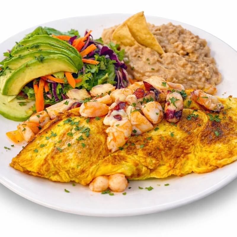 Esponjoso omelette relleno de una deliciosa mezcla de mariscos salteados al momento (camarón, pulpo y pescado), cocinados con mantequilla, ajo y un toque de especias.