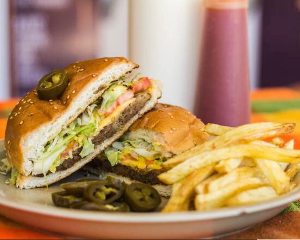 Carne de hamburguesa, lechuga, tomate, aguacate, crema, mostaza, cátsup y jalapeño.