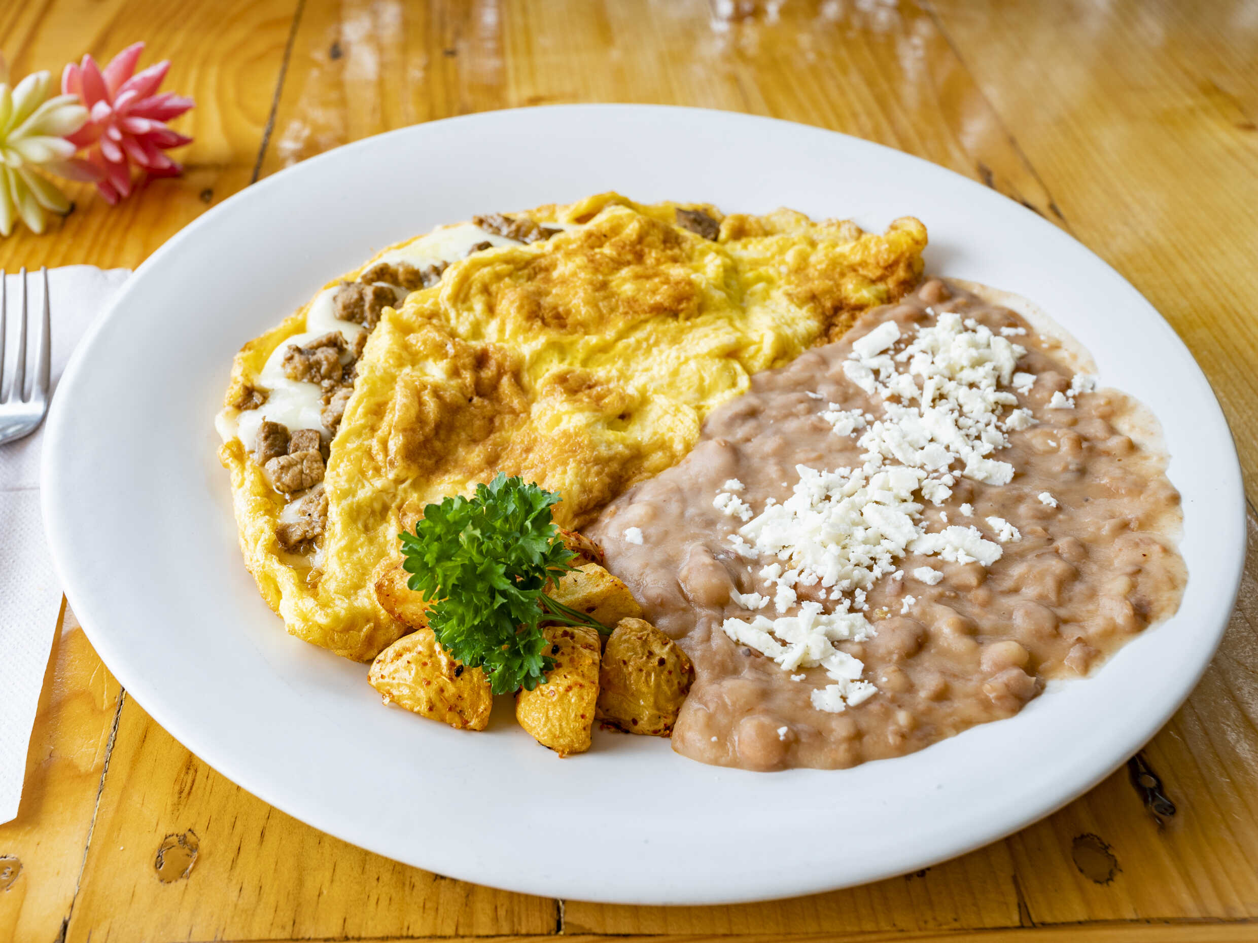 Burrito de bistec, empanada de carne, 2 huevos estrellados, frijoles y queso de la casa.