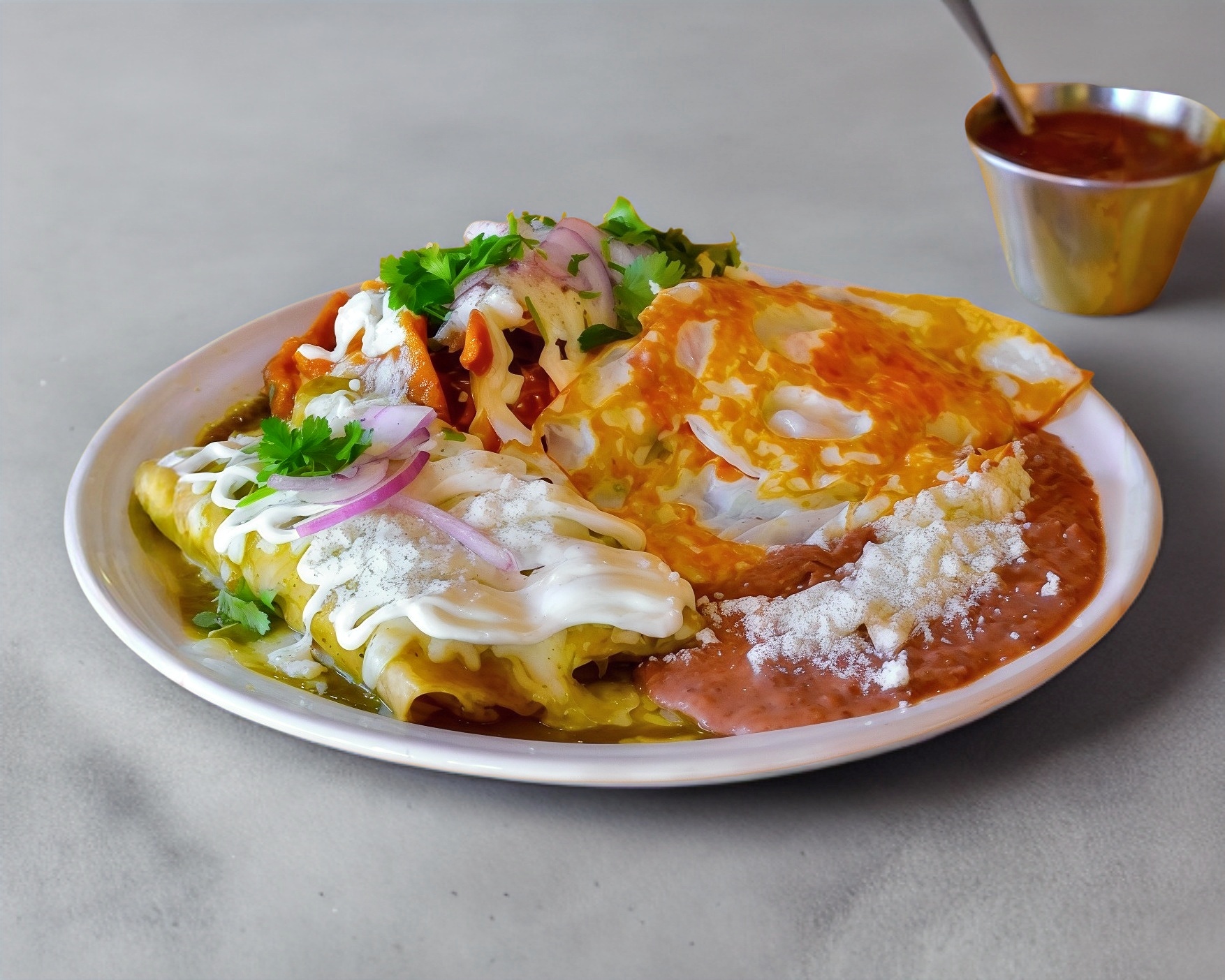 Dos enchiladas suizas, chilaquiles rojos, dos huevos y frijoles con queso.