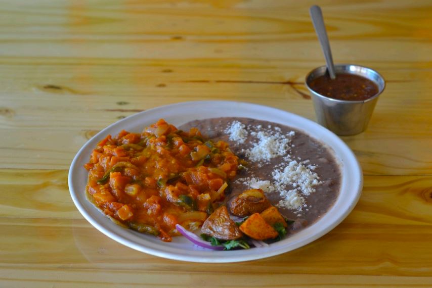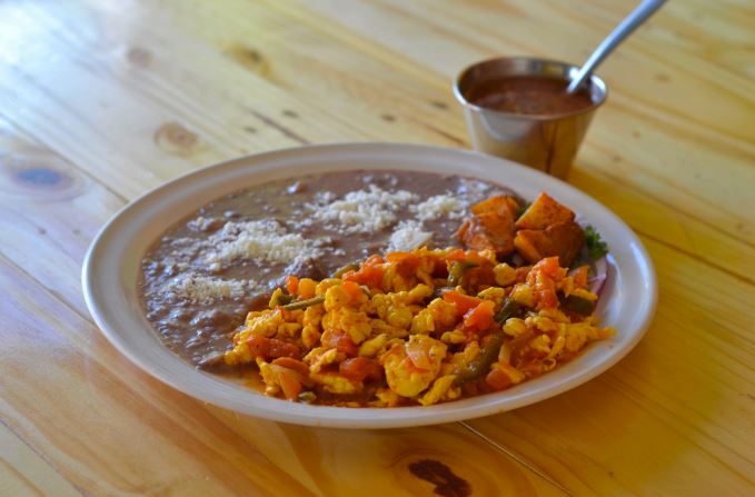 Huevos revueltos con jitomate, chile serrano, cebolla, acompañados de frijoles y queso de la casa.
