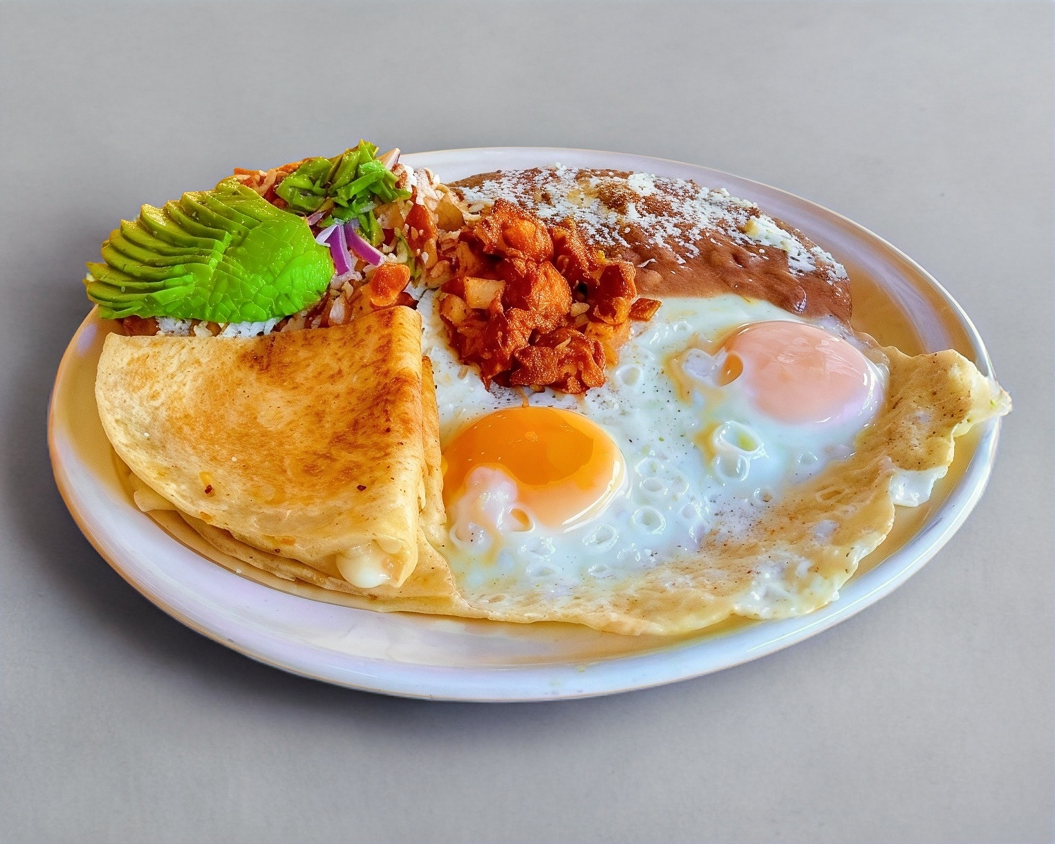 Huevos estrellados, y quesadilla doble de pierna en tortilla de harina, bañada en salsa roja o verde.