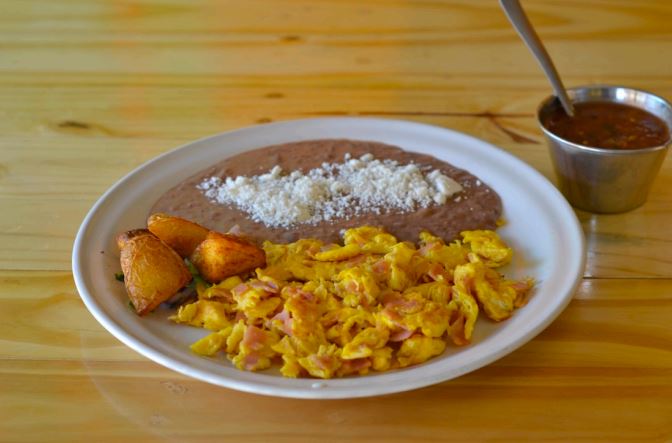Huevos revueltos con jamón, acompañados de frijoles y queso de la casa.
