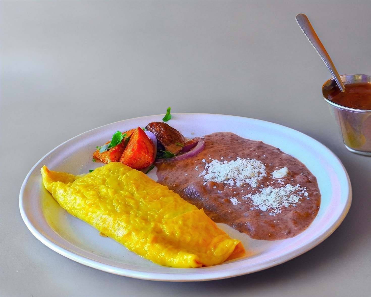 Omelette con espinaca, queso mozzarella, acompañados de frijoles y queso de la casa.